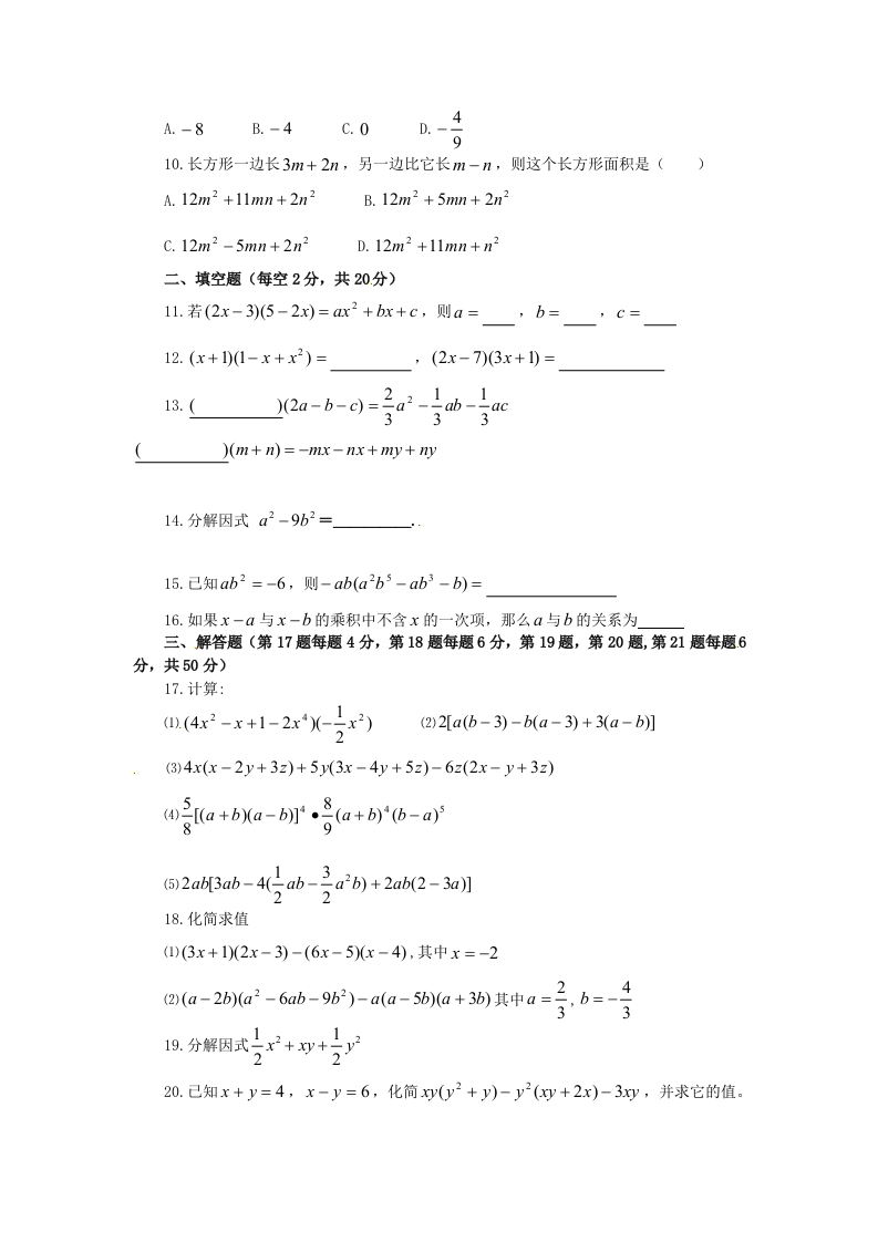 第九章《从面积到乘法公式》检测卷班级姓名成绩一、选择题(每题2分,共20分)1.8a3b3·(-2ab)3等于()A.0B.-16ab5C..-64abD.-16ab62.(-a2b3)3·(-a3b2c)2·(5abc)等于()A.-5a3b14c3B.-5a36b36c2C.5ab4c3D.5a36b36c23.单项式乘以多项式依据的运算律是()A.加法结合律B.乘法结合律C.乘法分配律D.乘法交换律4.方程2(3x-2)-(x-6)=4(x+2)的解为()A.x=2B.x=3C.x=6D.x=45.下列计算正确的是()A.(6xy2-4x2y)·3y=18xy2-12x2yB.(-x)2x+x2-1)=-x3-2x2+1C.(-3x2y(-2xy+3yz-1)=6x3y2-9x2y2z-3x2yD.(a--Ib)+2ab=3amb-ab2426.下列计算中(I)a(x-y)=arx-y:(2):b(xy)=bxby(3)b+y=b+b':4)2164=(64)3(5)x2m-1y2m-1=y2m-2正确的个数是()A.0个B.1个C.2个D.3个7.当a=-1时,n为整数,则-a+(a2m+3-a2m1-3a”1+6a")的值是()A.9B.3C.-3D.-98.如果(x+q)(x+)的积中不含x项,则g等于()B.5D.-59.多项式x2+x+b与多项式x2-ax-2的乘积不含x2和x3项,则b-2(a-)2的值是()
