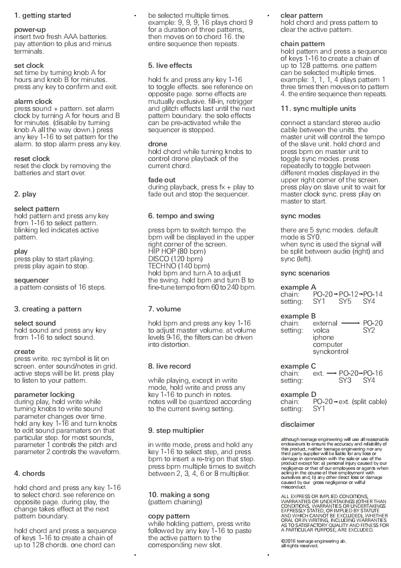 PO-20 arcademanual1一步-入又二ュ了儿break awayhangerselectedpocket operatortempoarcadetime noteadditional infoplay rec mode0000000000000000.ARCADE)1538soundindicates wntemode is acfive三parameters A/Bsoundfolding standto select sound holdABsound and press 1-160000000000000000alarmpatternknob A/Bto select pattemn holdA:parameter 1 B:parameter 2pattern and press 1-16sound pattern bpm mA:swingB:tempoA:drone level B:sidechainbpmchord controlpress to select tempo2茶34chordmhold to set master volume 1-16hold step 1-16+meffectsto set multiplierto toggle effects hold FX568FXand press 1-16play stopsound 1-16chord 1-169IO川÷12Lplayeffect 1-16write3+I4出I5I6 writeauto power off (a.p.o.)the unit auto powers off when no buttons are pressedfor a while,only powering the display to show time.press sound bpm to show battery status.press sound writeto manually power off.this ensures that recent modificationsto pattern data will survive a loss of power.sound 1-16chord 1-16effect 1-161.bass9arpeggio1.dm9.am1.solo chords9.fill-in2.bass drum10.melodic arp2.em10.C/A2.solo chords lead10.fill-in (fast)3.snare drum11.falling arp3.Esus11.dm/A3.solo drums11.retrigger4.hi-hat12.octave arp4.E12.D/A4.solo drums bass12.retrigger(fast)5.tom13.lead5.F13.A5.lowpass slow sweep13.alitch6.blip14.vibrato6.G14.B/A6.lowpass fast sweep14.glitch (fast)7.hardsync15.portamento7.C/G15.C7.highpass filter15.blinds8.noise fx16.echo8.E/G#16.D8.highpass sweep16.rising arpeggio