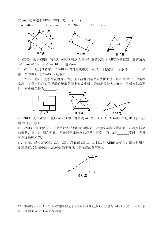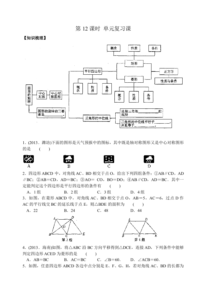 第12课时单元复习课【知识梳理】概念性质条件矩形平行四边形正方形装形性质与条件图形的旋转念件中心中心对对称称图形概质图形的旋转的三要连接二危形的是线段兰角形的中位线三角形的中位线平行于」并宜等宇1.(2013.潍坊)下面的图形是天气预报中的图标,其中既是轴对称图形又是中心对称图形的是()图ABD2.四边形ABCD中,对角线AC、BD相交于点O,给出下列四组条件:①AB∥CD,AD∥BC:②AB=CD,AD=BC:③AO=CO,BO=DO:④AB∥CD,AD=BC.其中一定能判定这个四边形是平行四边形的条件有()A.1组B.2组C.3组D.4组3.如图,在菱形ABCD中,对角线AC、BD相交于点O,AB=5,AC=6,过点D作AC的平行线交BC的延长线于点E,则△BDE的面积为()A.22B.24C.48D.44D第3趣竿4趣4.(2013.海南)如图,将△ABC沿BC方向平移得到△DCE,连接AD,下列条件中能够判定四边形ACED为菱形的是()A.AB=BCB.AC=BCC.∠B=60.D.∠ACB=60.5.如图,任意四边形ABCD各边中点分别是E、F、G、H,若对角线AC、BD的长都为