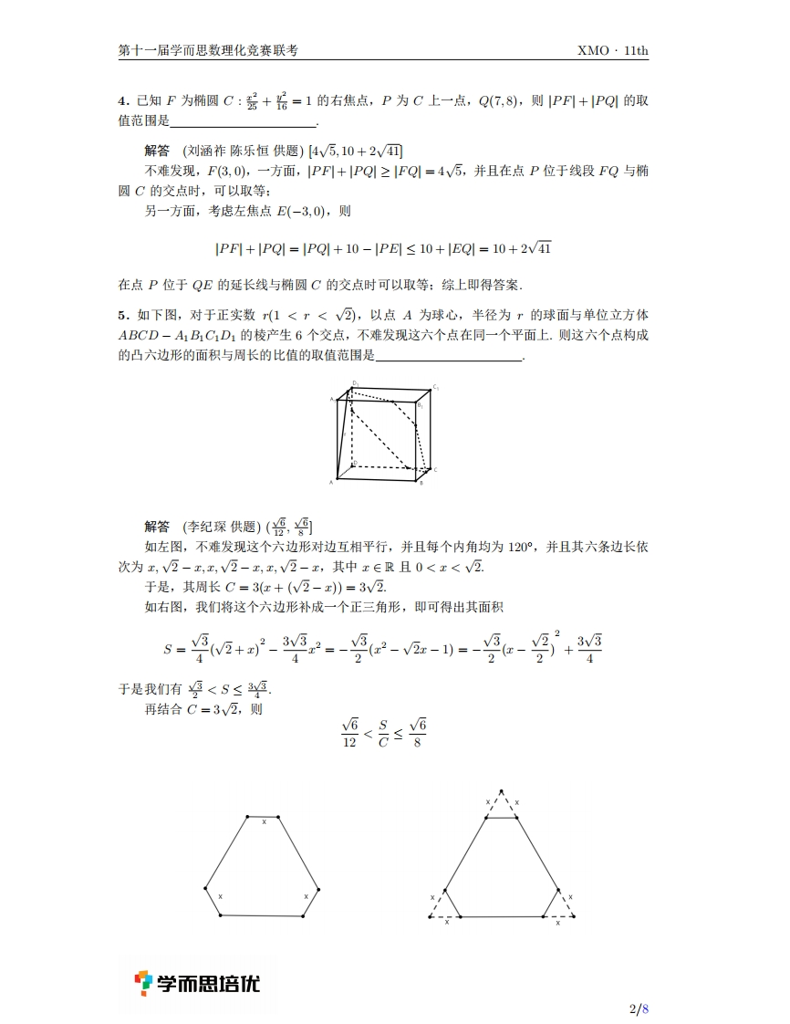 第十一届学而思数理化竞赛联考XM0·11th第十一届学而思数学竞赛联考一试试题时间:80分钟一、填空题(本大题共8小题,每小题8分,共64分)1.方程21og2(x-2)+10g2(x+1)=1的所有实数解为x=解答(刘涵祚陈乐恒供题)1+√原方程可以转化为(x-2)2(x+1)=2,化简得(x-1)(x2-2x-2)=0,得出x=1或x=1士,又由于x≥2,得出原方程的解为x=1+√.2.己知实数k∈R,平面上的向量1b1=1,若满足d,了的夹角为150°,且(d+)⊥(+k)的非零向量恰好有两个,则实数k的取值范围为解答(刘涵祚陈乐恒供题)(-o∞,0U{}U{3}由于(a+)上(a+k),则(a+)·(a+k)=0:即:部-3+山+部=02所以,P-+出1+k=0.不难发现,上述方程在(0,+∞)上恰好有一个实根当k≤0时,显然该方程有一正根和一非正根,满足条件:当k>0时,该方程的判别式△=(化+1)2-4k=0,化简得:3k2-10k+3=0解得:k=3或k=综上所述,k的取值范围是(-oo,0U{}U{3}3.己知正实数a,b,c依次构成等比数列,并恰好是△ABC的三边长,则的取值范围是解答(李纪琛供题)2,√⑤)不妨设a=1,b=x,c=x2(x≥1),则c为该三角形的最长边,于是1+x>x2,得出:1sx<1+v62而华==x+是设上述关于x的对勾函数为f(x),则不难发现在[L,)上,2≤f(x)