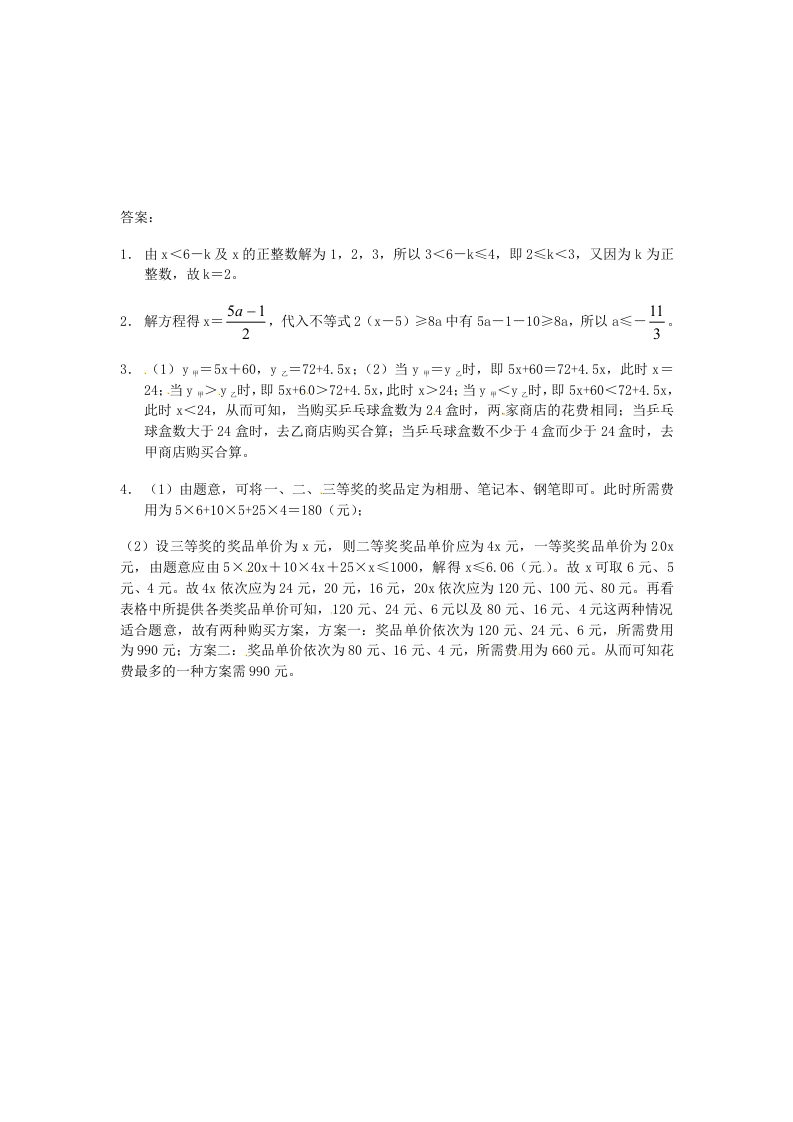 一元一次不等式创新训练4:1.如果关于x的不等式一k一x+6>0的正整数解为1,2,3,正整数k应取怎样的值?2.己知方程3(x一2a)+2=x-一a+1的解适合不等式2(x一5)≥8a,求a的取值范围。3.甲、乙两家体育用品商店出售同样的乒乓球拍和乒乓球,乒乓球拍每副定价20元,乒乓球定价每盒5元,现两家商店搞促销活动,甲店:每买一副乒乓球拍赠送一盒乒乓球:乙店:按定价的九折优惠。某边需购球拍4副,乒乓球若干盒(不少于4盒)。(1)设购买乒乓球盒数为x(盒),在甲商店付款为y(元),在乙商店付款为yz(元),分别写出y,yz与x的关系式:(2)就乒乓球盒数讨论去哪家商店买合算?4.某校举行庆祝“十六大”的文娱汇演,评出一等奖5个,二等奖10个,三等奖25,个,学校决定给获奖的学生发奖品,同一等次的奖品相同,并且只能从下表所列物品中选取一件:品名小提琴运动服笛子舞鞋口琴相册笔记本钢琴单价/元1208024221664(1)如果获奖等次越高,奖品单价就越高,那么学校最少要花多少钱买奖品?(2)学校要求一等奖奖品单价是二等奖奖品单价的5倍,二等奖奖品单价是三等奖奖品单价的4倍,在总费用不超过1000元的前提下,有几种购买方案?花费最多的一种方案需多少钱?