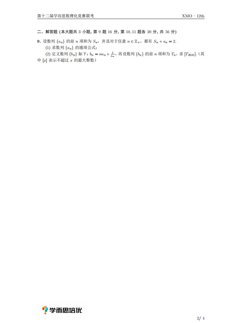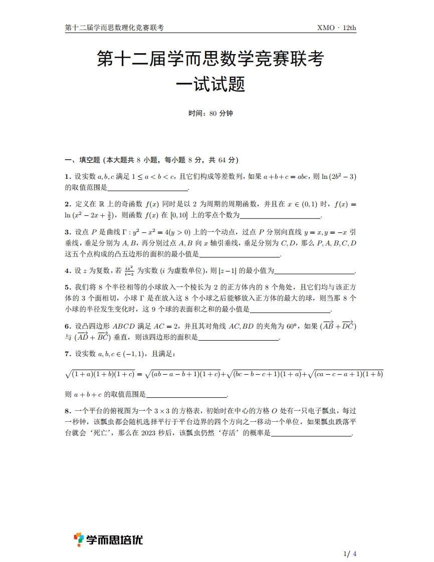 第十二届学而思数理化竞赛联考XM0·12th第十二届学而思数学竞赛联考一试试题时间:80分钟一、填空题(本大题共8小题,每小题8分,共64分)1.设实数a,b,c满足1≤a0)上的一个动点,过点P分别向直线y=x,y=-x引垂线,垂足分别为A,B,再分别过点A,B向x轴引垂线,垂足分别为C,D,那么P,A,B,C,D这五个点构成的凸五边形的面积的最小值是4.设之为复数,若号为实数(位为虚数单位),则2-1川的最小值为5.我们将8个半径相等的小球放入一个棱长为2的正方体内的8个角处,且它们均与该正方体的3个面相切,小球下是在放入这8个小球之后能够放入正方体的最大的球,则当那8个小球的半径发生变化时,这9个球的表面积之和的最小值是6.设凸四边形ABCD满足AC=2,并且其对角线AC,BD的夹角为60°,如果(AB+D乙)与(AD+BC)垂直,则该四边形的面积是」7.设实数a,b,c∈(-1,1),且满足:vV(1+a)(1+b(1+c)=v(ab-a-b+1)1+c)+v6c-b-c+1)1+a)+√(ca-c-a+1)(1+b)则a+b+c的取值范围是8.一个平台的俯视图为一个3×3的方格表,初始时在中心的方格O处有一只电子瓢虫,每过一秒钟,该瓢虫都会随机选择平行于平台边界的四个方向之一移动一个单位,如果瓢虫跌落平台就会‘死亡',那么在2023秒后,该瓢虫仍然‘存活’的概率是?学而思培优1/4