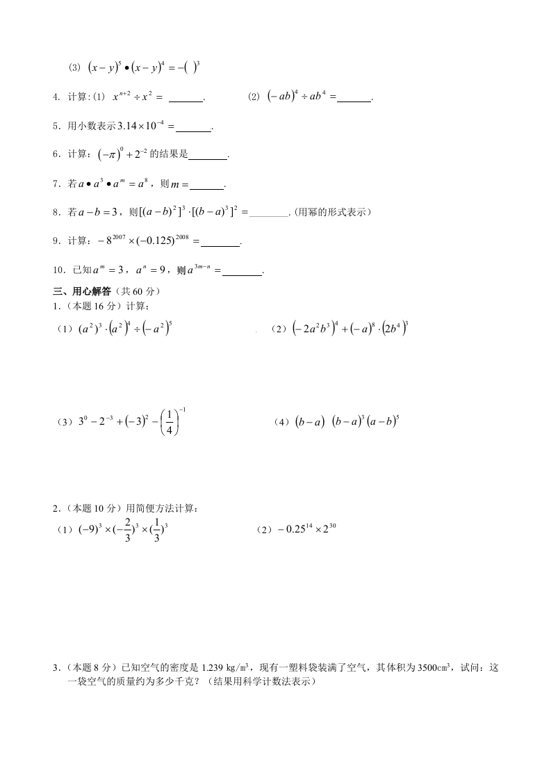 第八章幂的运算综合测试卷8一、做出你的选择(每题3分,共30分)1.下列各式中,正确的是()A.m4.m=m8B.m5.m5=2m25C.7m3.m3=m9D.y6.y6=2y22.实验表明,人体内某种细胞的形状可近似地看作球,它的直径约为0.00000156m,则这个数用科学记数法表示是()A.15.6×10-5mB.0.156×10-7mC.1.56×106mD.1.56×10-m3.在等式a3·a2.()=a”中,括号里面的代数式是()A.a'B.a·C.a6D.a34.在下列括号中应填入a的是()A.a2=()2B.a2=()月c.a2=()4D.a2=()65.(-a")2"的结果是()A.-a3B.a3nC.-a2nD.a2n26.若am=2,a”=3则am+”等于()A.5B.6C.8D.97.若(xmy")3=x9y5则m、n的值分别为()A.9,5B.3,5C.5,3.6,128.-x”与(-x)”的正确关系是()A.相等B.互为相反数C.当n为奇数时它们互为相反数,当n为偶数时相等D.当n为奇数时相等,当n为偶数时互为相反数9.知果a=(208,b=(0,c-(),那么a,6e三数的大小为()A.c>a>bB.c>b>aC.a>c>bD.a>b>c10.8·2等于()A.16hB.16a+6C.10+bD.23a+h二、填得圆圆满满(每题3分,共30分)1.计算:(1)(y求=(2)a2(a=(3)(a÷(a)=2.填上适当的指数:(1)a4。a)=a(2)a5÷a)=a(3)(ay=a3.填上适当的代数式:(1)x3·x.()=x8(2)a2÷()=a6