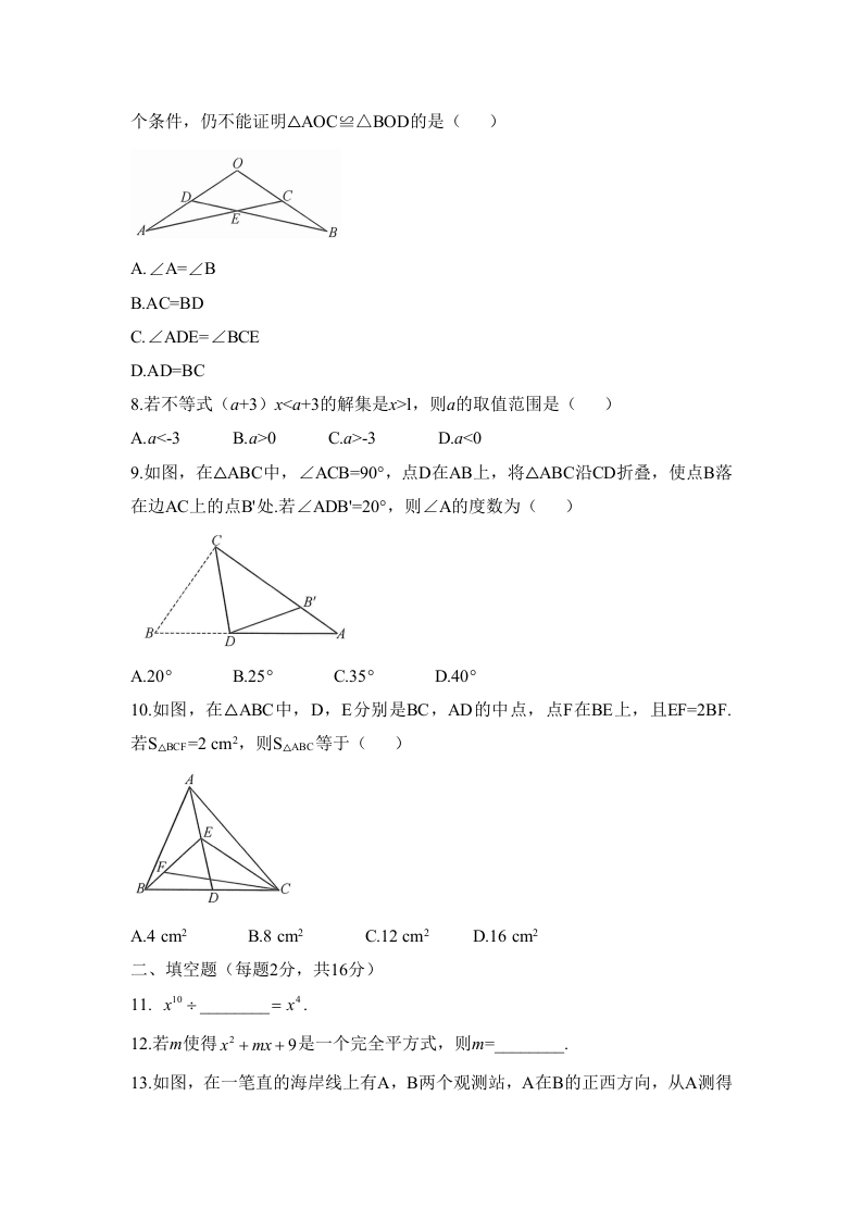 第二学期期末模拟试卷(八)一、选择题(每题2分,共20分)1.下列计算正确的是()A.a+a=aB.a5÷a3=a2C.aa2=a%D.(a)2=a62.据统计,2019年长三角地区生产总值合计237000亿元,将数237000用科学记数法表示为()A.0.237×10B.2.37×10C.2.37×10D.23.7×103.下列长度的三条线段,能首尾相连围成三角形的是()A.1 cm,2 cm,3 cmB.2 cm,3 cm,4cmC.14 cm,4cm,9 cmD.7 cm,2 cm,4 cm4.已知a心b,c≠0,则下列不等式一定成立的是()A.c+a-c+bB.0