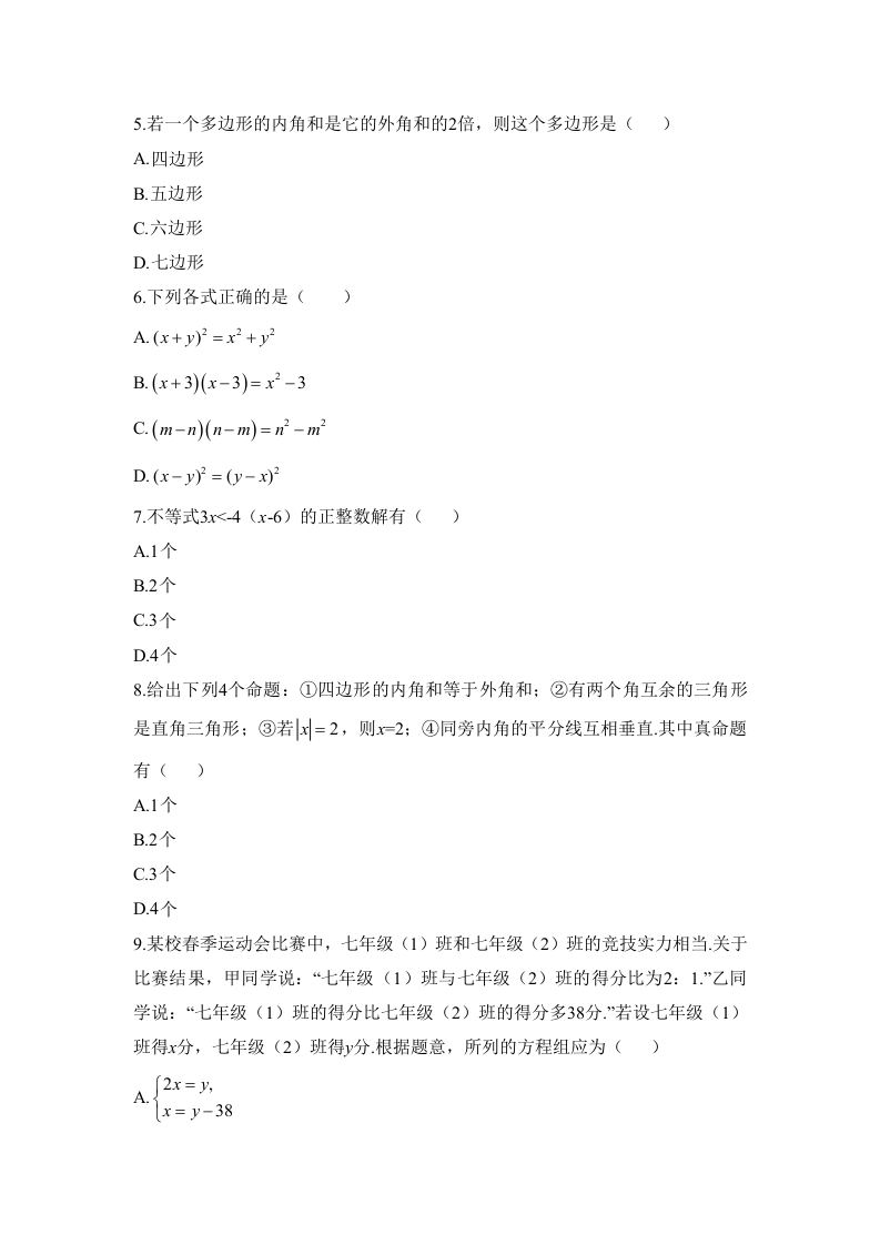 第二学期期末模拟试卷(十)一、选择题(每题2分,共20分)1.下列运算正确的是()A.(x3)=xB.x2.x=xC.x÷x=xD.x+x2=x2.若ab+2cD.2ac<2bc3.下列各式从左到右的变形,属于因式分解的是()A.(x+1)(x-1)=x2-1B.x2-y2=(x+y)(x-y)C.x2-2x+1=x(x-2)+1D.(x+y)2=x2+2y+y24.如图,B,C,D三点在同一条直线上,AB∥CE.若∠A=55°,∠ACB-65°,则∠1的值为()A.80°B.650C.60°D.55o