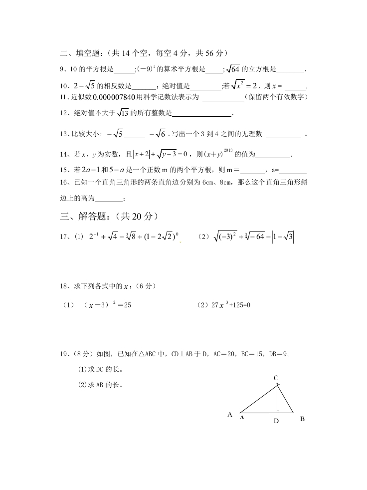 第二章检测试题一、选择题:(共8小题,每题3分,共24分)1、16的平方根是(A.4B.±4C.256D.±2562、下列各数:元,0,5,0.23,222,0.308003,1-V5,8中无理数个数为().A.2个B.3个C.4个D.5个3、下列等式:①②-2沙=-2,®V2=2,④8=-8⑤√16=4,⑥-√4=-2:正确的有()个A.4B.3C.2D.14、适合下列条件的△ABC中,直角三角形的个数为().1,110a=3b=4c=5②a=3,b=4,c=6:③∠A=32°,∠B=58°:④a=7,b=24,c=25;⑤a=2,b=2,c=4.A、2个:B、3个:C、4个:D、5个5、我国国土面积约为9.6×10m,由四舍五入得到的近似数9.6×10°().A.有三个有效数字,精确到百分位B.有三个有效数字,精确到百万分位C.有两个有效数字,精确到十分位D.有两个有效数字,精确到十万位6、估算V19+2的值在().A.5和6之间B.6和7之间C.7和8之间D.8和9之间7、已知一个直角三角形的两边长分别为3和4,则第三边长是().A.5B.25C.万D.5或万8、等边三角形的边长为2,则该三角形的面积为(A.4V5B.5C.2W5D.3