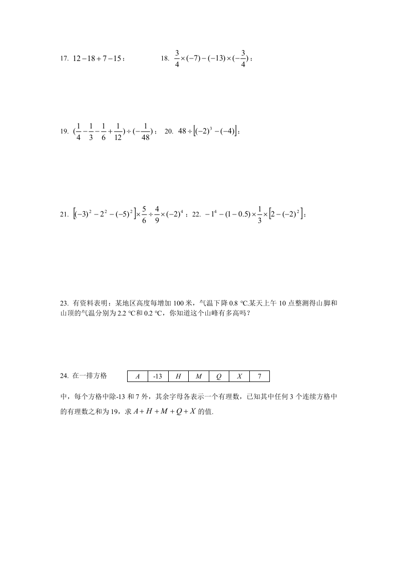 七年级数学第二章检测题满分:100分时间:45分钟一、耐心填一填:(每空3分,共48分)1.3的相反数为:-2二的倒数为-(-2)3=2.绝对值等于2的数为:平方得25的数为643.用“>”或“<”填空:-卜3-(-3.0:68—74数轴上到原点的距离为1二的点表示的有理数是】5.设是a最小的自然数,b是最大的负整数,c是绝对值最小的有理数,则a-b+=6.用科学记数法表示51200000=7计算:-22+(-22-卜fx(4)2=38.若a、b互为相反数,c、d互为倒数,则a+b+cd+1=9.在-24中,底数为,指数为一,乘方的结果为10.己知a>0,b<0,且d<吲,则a+b0.(填“>”或“<”号)二、精心选一选:(每题3分,共18分)1.有下列各数:10,-667.0.-90,001,号,-(←3到.-十2斗,-(4其中,属于非负整数的共有()A.1个B.2个C.3个D.4个12.在一个数的前面加上一个“”号,就可以得到一个()A.负数B.非正数C.正数或负数D.原数的相反数13.下列各组数中,互为相反数的是()A2与号B-与1C-1与-D2214.若两个数的和为负数,则下列结论正确的是()A.两数都是负数B.只有一个是负数C.至少有一个是负数D.两数都是非负数15.三个数的和大于0,积小于0,那么这三个数中负数有()A.0个B.1个C.2个D.3个16.下列运算正确的是()A.-22÷(-2)2=1B.(-223=-81327c-5+1x2-253D.3-×(-3.25)-6×3.25=-32.5354三、用心做一做:(17一22每题4分,23、24每题6分,共36分)