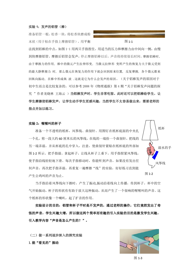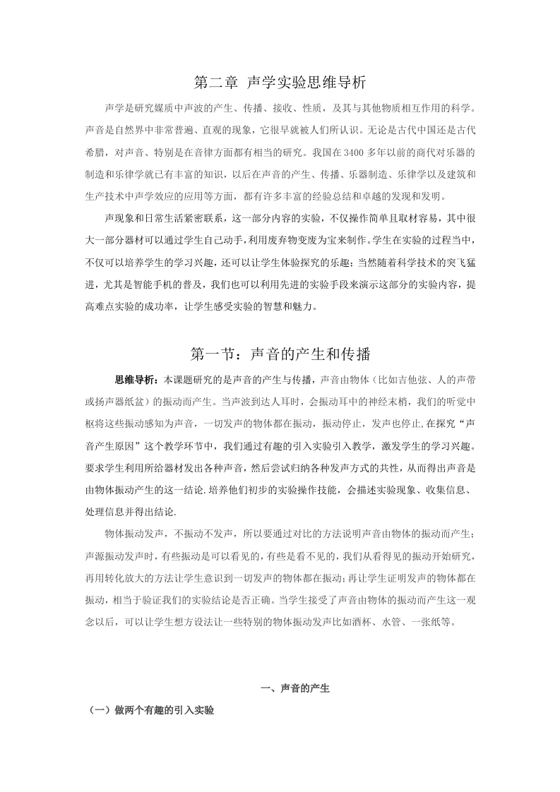 第二章声学实验思维导析声学是研究媒质中声波的产生、传播、接收、性质,及其与其他物质相互作用的科学。声音是自然界中非常普遍、直观的现象,它很早就被人们所认识。无论是古代中国还是古代希腊,对声音、特别是在音律方面都有相当的研究。我国在3400多年以前的商代对乐器的制造和乐律学就己有丰富的知识,以后在声音的产生、传播、乐器制造、乐律学以及建筑和生产技术中声学效应的应用等方面,都有许多丰富的经验总结和卓越的发现和发明。声现象和日常生活紧密联系,这一部分内容的实验,不仅操作简单且取材容易,其中很大一部分器材可以通过学生自己动手,利用废弃物变废为宝来制作。学生在实验的过程当中,不仅可以培养学生的学习兴趣,还可以让学生体验探究的乐趣:当然随着科学技术的突飞猛进,尤其是智能手机的普及,我们也可以利用先进的实验手段来演示这部分的实验内容,提高难点实验的成功率,让学生感受实验的智慧和魅力。第一节:声音的产生和传播思维导析:本课题研究的是声音的产生与传播,声音由物体(比如吉他弦、人的声带或扬声器纸盆)的振动而产生。当声波到达人耳时,会振动耳中的神经末梢,我们的听觉中枢将这些振动感知为声音,一切发声的物体都在振动,振动停止,发声也停止,在探究“声音产生原因”这个教学环节中,我们通过有趣的引入实验引入教学,激发学生的学习兴趣。要求学生利用所给器材发出各种声音,然后尝试归纳各种发声方式的共性,从而得出声音是由物体振动产生的这一结论.培养他们初步的实验操作技能,会描述实验现象、收集信息、处理信息并得出结论物体振动发声,不振动不发声,所以要通过对比的方法说明声音由物体的振动而产生:声源振动发声时,有些振动是可以看见的,有些是看不见的,我们从看得见的振动开始研究,再用转化放大的方法让学生意识到一切发声的物体都在振动:再让学生证明发声的物体都在振动,相当于验证我们的实验结论是否正确。当学生接受了声音由物体的振动而产生这一观念以后,可以让学生想方设法让一些特别的物体振动发声比如酒杯、水管、一张纸等。一、声音的产生(一)做两个有趣的引入实验