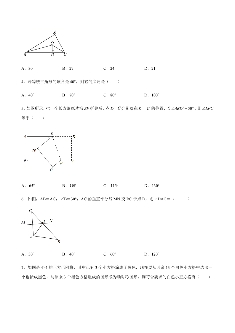 第二章轴对称图形单元检测卷总分:150分难度:易一、单选题(每题3分,共24分)1.下列图形中,是轴对称图形的是(B↓个2.按以下步骤进行尺规作图:(1)以点O为圆心,任意长为半径作弧,交∠AOB的两边OA、OB于D、E两点:(2)分别以点D、E为圆心,大于DE的长为半径作弧,两弧交于点C:(3)作射线OC,并连接CD、CE.下列结论不正确的是()BEA.OC垂直平分DEB.CE=OEC.∠DCO=∠ECOD.1=∠23.如图,己知△ABC的周长是18cm,∠ABC和∠ACB的角平分线交于点O,OD⊥BC于点D,若OD=3Cm,则△ABC的面积是()cm2.