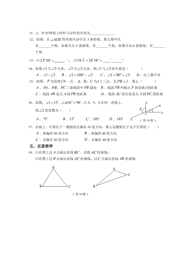 数学学科第六章小结与思考课《第六单元小结与思考》学讲预案一、自主先学书上的概念黑体字.二、合作助学1.如图,在这个正方形网络中,(1)找出相互平行的线段:(2)找出与DE相互垂直的线段:(3)这个八边形的八个角相等吗?八条边呢?2.计算:(1)、15319'41"+2043'48"(2)、11036'-90.82°(结果用度表示)3.作图并填空y如图,过点A画线段AB,使线段AB⊥直线I,且点B为垂足,线段AB的长度就是的距离。4.己知∠a与∠B互为补角,且∠a比∠B大25°,求这两个角三、拓展导学B5.集队时,我们利用了“”这一数学原理,6.时钟从8点15分走到8点35分,分针转了°,时针转了°.(第7趣)北7.如图,OA⊥BC,∠2-∠I=20°,则∠BOD=°.8.(I)如图,射线OA表示偏30°方向,射线OB表示方向:(2)请在图中标出南偏西40°方向的射线OF,东南方向的射线OH南9.如图,∠AOB=∠COD=90°,(第8题)(I)∠AOC等于∠BOD吗(2)若∠BOD=150°,则∠BOC等于多少度?四、检测促学10、如图,D是AB中点,E是BC中点,图中共有线段条,(I)若AB=3,BC=5,DE=(第9题)(2)若AC=8,EC=3,AD=A D B E(第10题)(第12题)