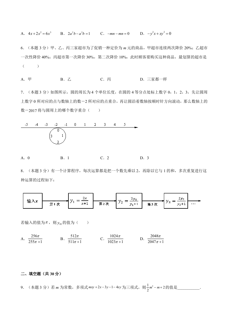 第三章代数式单元检测卷总分:120分范围:第三章代数式难度:较难一、单选题(共24分)1.(本题3分)一个篮球的单价为a元,一个足球的单价为b元(b>),小明买了6个篮球和2个足球,小国买了5个篮球和3个足球,小国比小明多花()A.(a-b)元:B.(b-a)元:C.(a-5b)元:D.(5b-a元2.(本题3分)下列说法正确的是()A.单项式x的系数是0B.单项式-32x2的系数是-3,次数是5C.多项式x2+2x的次数是2D.单项式-5的次数是13.(本题3分)某人骑自行车t(小时)走了s(km),若步行s(km),则比骑自行车多用3(小时),那么骑自行车每小时比步行多走()(km).SSA.1-31B.C.s(t+s)D.s(t-3)t1+34.(本题3分)如果在数轴上表示a,b两个有理数的点的位置如图所示,那么口-b-a+化简的结果为()女0A.2aB.-2aC.0D.2b5.(本题3分)下面合并同类项正确的是()
