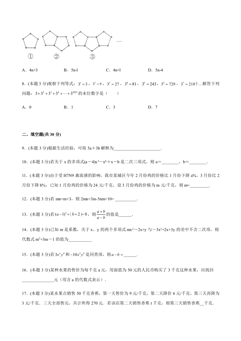 第三章代数式单元检测卷总分:120分范围:第三章代数式难度:中等一、单选题(共24分)1.(体题3分)代数式-05xy-x+,x21、×。x一”之1,2x5·5扫·是鉴无的有《πyA.3个B.4个C.5个D.6个2.(本题3分)如果长方形的一边长为(3a+2b),另一边长比它短(ab(a>b),那么这个长方形的周长为()A.5a+5bB.10a+10bC.10a+6bD.14a+6b3.(本题3分)下列运算正确的是()A.2(a-1)=2a-1B.a2+a2=2a2C.2a3-3a3=dD.ab-ab=04.(本题3分)若|aF5,b=9,且a