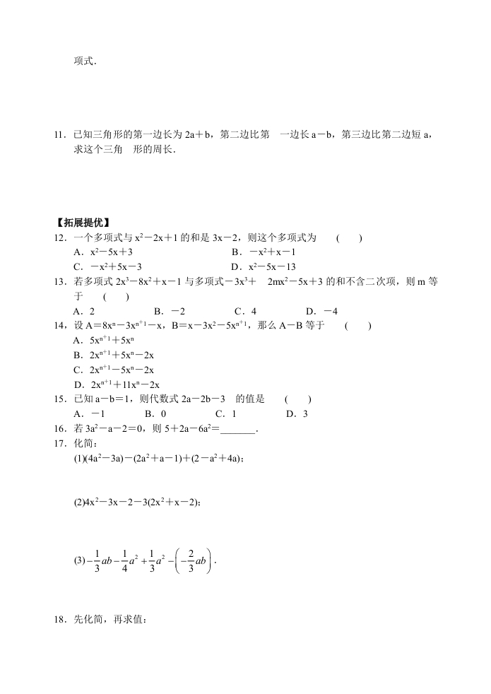 第6课时整式的加减【基础巩固】1.化简3x-2(x一3y)的结果是2.已知单项式3amb:与-二a61的和是单项式,那么m=n3.三个连续偶数中,是最小的一个,这三个数的和为4.若A=x2-xy-y2,B=-2xy-3y2,则2A-3B=5.下面计算正确的是()A.3x2-x2=3B.3a2+2a3=5aC.3+x=3xD.-0.25ab+-ba=046.下列计算正确的是()A.3x2+x2=3B.x3+2x5=3x8C.-5x-2x=-3xD.-2xy2+xy2=-xy27.下列计算正确的是()A.x2+x4=x6B.x2+x2=2x4C.2x2-x2=-x2D.-5x2+x2=-4x28.计算:(1)-st-3st+6:(2)8a-a3+a2+4a3-a2-7a-6:GX3a+ab)-(3ab2+ab):(4)7p3+p2-p-1)-2p3+p):457xy+y+4+6x-2y-5xy-3:(63(-2ab+3a)-(2a-b)+6ab.9.先化简,再求值:4-6y-26y-2》-t1.其中x=-3y=410.已知多项式3x2-4x4+2x一2,减去另一个多项式所得的差是x4一x3+2x2,求该多