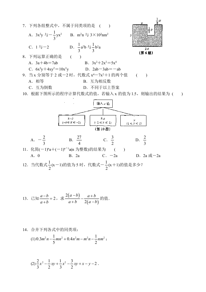 第7课时代数式单元复习【知识整理】川:尿云班单以次数、系数单时式北敬式整式多项火活合并类列列代微火多页式的项、次数路的球求引(赴式州1.代数式是用把数字和字母连接起来的式子】2.单项式是特殊的代数式,在单项式中连接字母和数的运算只能是:数字因数称为单项式的单项式中所有字母指数的称为单项式的次数3.多项式是由若干个单项式相加而成的,每个单项式称为多项式的,一个多项式含有几项,就称几项式,次数最高项的次数,称为多项式的和统称为整式5.叫同类项6.叫合并同类项.7.去括号法则:8.进行整式加减是一般先再【单元训练】1.小刚拿100元钱去买单价为4.5元的钢笔n支,则剩下的钱为元:小明最多能买这种钢笔支2.当a=一4,b=-12时,代数式a-2的值为3.已知2x一y=3,则1-4x+2y的值为4.若a+b=5ab,则上+上5.己知船在静水中的速度为xkmh,水流速度为3km/h(x>3),A、B两地相距skm,则在A、B两地间往返一次共需h.6.如图,阴影部分的周长为面积为·当x=7.5,y=6时,阴影部分的周长是,面积是