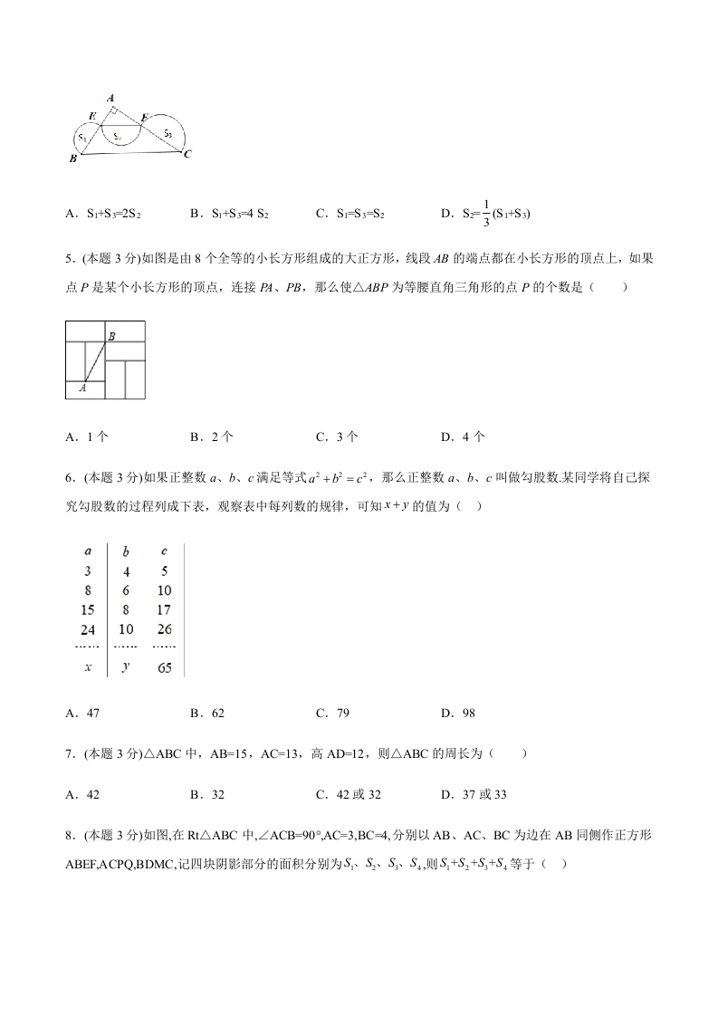第三章勾股定理单元检测卷总分:150分范围:勾股定理难度:较难一、单选题(共24分)1.(本题3分)下列条件不能判定一个三角形为直角三角形的是()A.三个内角之比为1:2:3B.一边上的中线等于该边的一半Q三边为时}D.三边长为m2+n2m2-n2、2mn(m>n>0)2.(本题3分)如图,小巷左右两侧是竖直的墙,一架梯子斜靠在左墙时,梯子底墙到左墙角的距离为1.5m,顶端距离地面2m,如果保持梯子底端位置不动,将梯子斜靠在右墙时,顶端距离地面0.7m,那么小巷的宽度为(A.3.2mB.3.5mC.3.9mD.4m3.(本题3分)点P在等腰R△4BC的斜边AB所在直线上,若记:k=AP2+BP2,则()A.满足条件k<2CP2的点P有且只有一个B.满足条件k<2CP2的点P有无数个C.满足条件k=2CP2的点P有有限个D.对直线AB上的所有点P,都有k=2CP24.体题3分)如图,已知在RIAABC中,EF分别是边ABAC上的点AE写AB,AF写AC,分别以BE,EF、FC为直径作半圆,面积分别为S1,S2,S,则S,S2,S3之间的关系是()