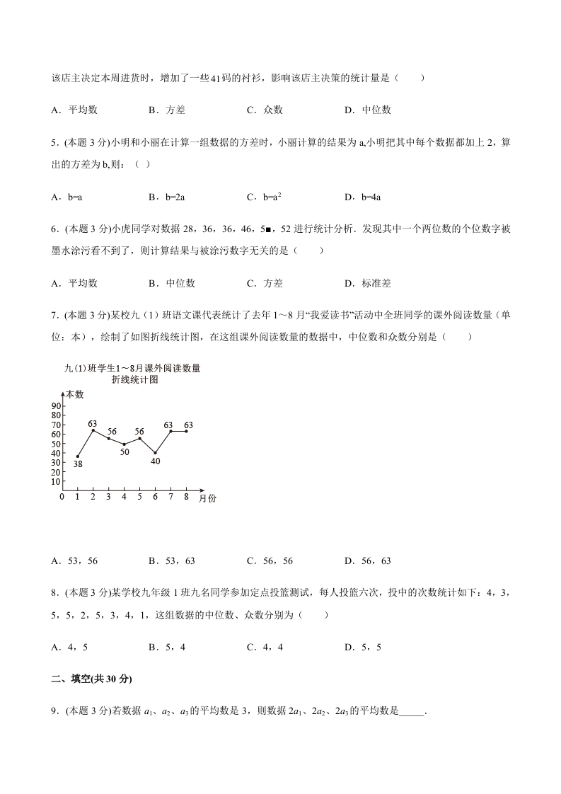 第三章数据的集中趋势和离散程度单元检测卷总分:150分范围:九年级上册第三章难度:中等一、单选(共24分)1.(本题3分)丽华根据演讲比赛中九位评委所给的分数作了如下表格:平均数中位数众数方差8.58.38.10.15如果去掉一个最高分和一个最低分,则表中数据一定不发生变化的是()A.平均数B.众数C.方差D.中位数2.(本题3分)若x,x,X,x的平均数为4,x,x6,x,…,x。的平均数为6,则x,x2,…,x的平均数为()A.5B.4.8C.5.2D.83.(本题3分)某篮球队5名场上队员的身高(单位:cm)是:183、187、190、200、210,现用一名身高为195cm的队员换下场上身高为210cm的队员,与换人前相比,场上队员的身高()A.平均数变大,方差变大B.平均数变小,方差变大C.平均数变大,方差变小D.平均数变小,方差变小4.(本题3分)某专卖店专营某品牌的衬衫,店主对上一周中不同尺码的衬衫销售情况统计如下:尺码39404243平均每天销售数量(件)1012201212