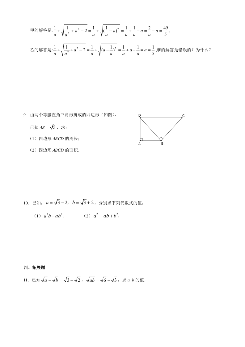 第十二章二次根式第4课时二次根式的乘除(2)一、选择题1.下列计算正确的是【】A.(-2)°=0B.32=-9C.5=3D.互+5=52.下列各式中化简正确的是【】A.Jab =ab B.c.D.5ab+sa+b24二、填空题3.计算:V152-102×V52+122=:6W3×5V6=_4.已知矩形长为2√3cm,宽√6为cm,那么这个矩形对角线长为C72.第5题图5.如图所示,有一边长为8米的正方形大厅,它是由黑白完全相同的方砖密铺而成。则一块方砖的边长为6.(2013江西)如图,矩形ABCD中,点E、F分别是AB、CD的中点,连接DE和BF,分别取DE、BF的中点M、N,连接AM,CN,MN,第6题图若AB=2√2,BC=2√3,则图中阴影部分的面积为三、解答题7.计算:②V18·V(-54)(-32)③V5√2+2W5.V5√2-2W58甲、乙两人对愿目“化简并求值:号+怎+a-2,其中a三有不同的解答