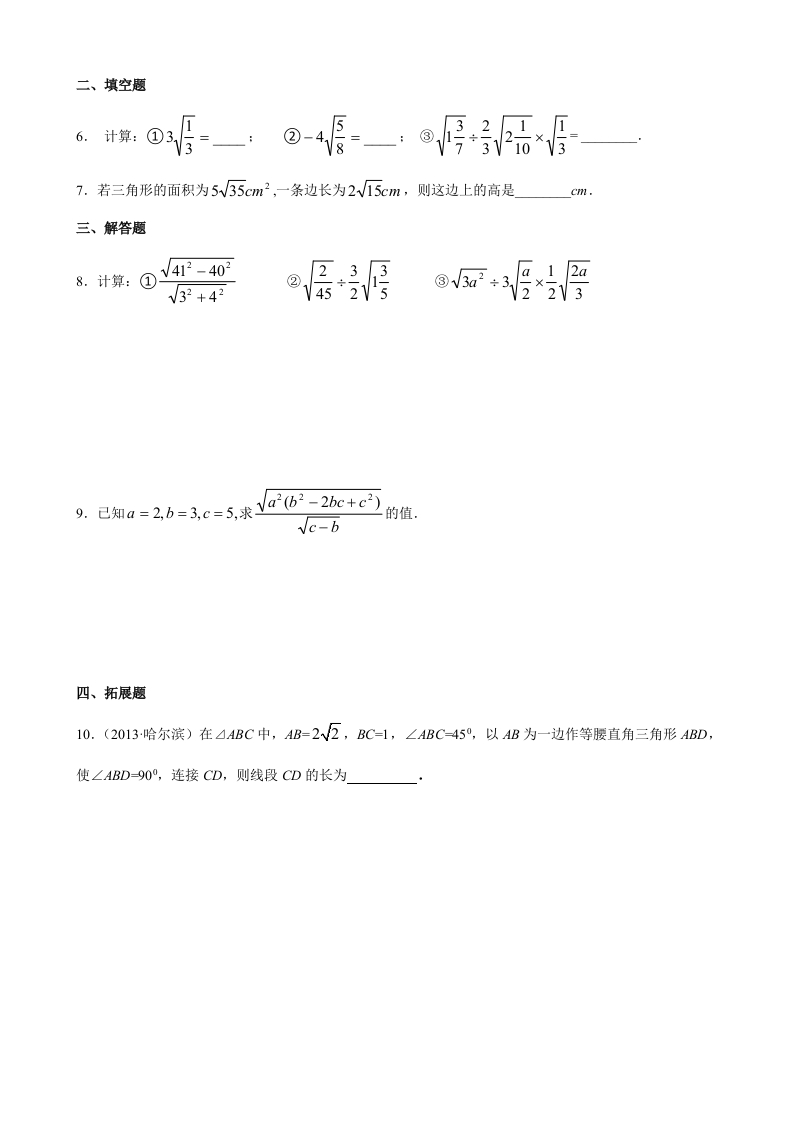第十二章二次根式第5课时二次根式的乘除(3)一、选择题1.下列计算中正确的是【】D.0可÷76四=92.给出下列四道算式:其中正确的算式是【】(1)V-42ab4(2)V32+42v√4abV52-32(3)28x=4x:(4)/(b-a)=√a-b(a>b)√7xa-bA.(1)和(3)B.(2)和(4)C.(1)和(4)D.(2)和(3)3.下列化简中正确的是【】-42B.-10W0.1=V(-10)2×0.1=√10c.D.m_5m√mnn4.2013临沂)计算48-95的结果是【】A.-√5B.3c.-5D.35。将-4厚根号外的因武移进根号内,结果等于【】A.-B.√而c.-4D.√44