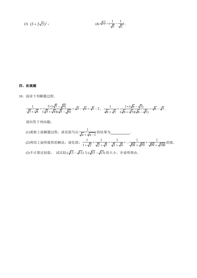 第十二章二次根式第8课时二次根式的加减(2)一、选择题1.(2013常德)计算√2×√8+-27的结果为【】A.-1B.1C.4-3W5D.72.若x-y=√反-1,y=√反,则代数式(x-1)(y+1)的值等于【】A.2W2+2B.2V2-2C.2V5D.23.计算瓜历+3召-网)的结果是【】A.6B.45C.2W5+6D.124.若+-6,01,则-的值是【】A.-2B.-2C.±2D.±2二、填空题5.(2013宿迁)计算√2(2-√5)+√6的值是6.计算:x5-1=57.己知√3的小数部分为a,则a(a+2)=已知2+5传=4那么:的值为三、解答题