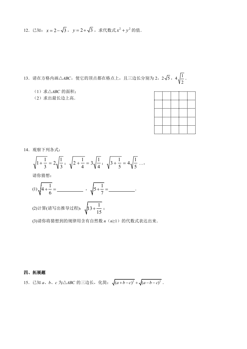 第十二章二次根式第9课时单元复习348072@abc4个月前发布关注私信0.19MB4页025第十二章二次根式第9课时单元复习此内容为付费资源,请付费后查看¥11¥31黄金会员免费钻石会员免费立即购买您当前未登录!建议登陆后购买,可保存购买订单付费资源 第1页 / 共4页 第2页 / 共4页 试读已结束,还剩2页,您可下载完整版后进行离线阅读 THE END初中教育学习资源小学教育教育学类高中教育高考真题 文本预览 第十二章二次根式第9课时单元复习一、选择题1.下列各式一定是二次根式的是【】A.7B.2mC.√a2+12.(2013娄底)式子2x+有意义的x的取值范围是【】x-1A.2-且x≠1c.2212B.x≠1D.x>-23.己知:√20n是整数,则满足条件的最小正整数n为【】A.2B.3C.4D.54.己知a 查看更多 收起部分 喜欢就支持一下吧收藏 上一篇 第十二章二次根式第8课时二次根式的加减(2) 下一篇 第十二章机械能和内能章末测试卷2021—2022学年苏科版九年级物理上册 评论 抢沙发 请登录后发表评论 登录 注册 请登录后查看评论内容