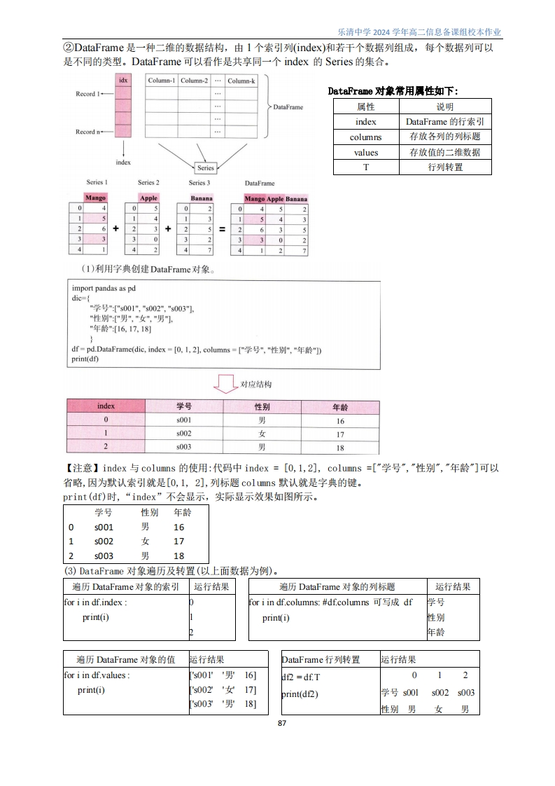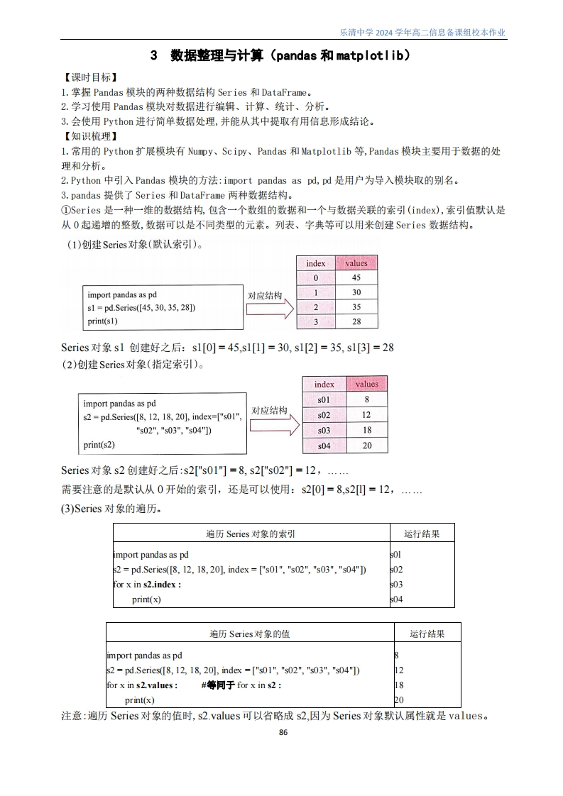 乐清中学2024学年高二信息备课组校本作业3数据整理与计算((pandas和matplotlib)【课时目标】l.掌握Pandas模块的两种数据结构Series和DataFrame。2.学习使用Pandas模块对数据进行编辑、计算、统计、分析。3.会使用Python进行简单数据处理,并能从其中提取有用信息形成结论。【知识梳理】l.常用的Python扩展模块有Nupy、Scipy、Pandas和Matplotlib等,Pandas模块主要用于数据的处理和分析。2.Python中引入Pandas模块的方法:import pandas as pd,pd是用户为导入模块取的别名。3.pandas提供了Series和DataFrame两种数据结构。①Series是一种一维的数据结构,包含一个数组的数据和一个与数据关联的索引(index),索引值默认是从0起递增的整数,数据可以是不同类型的元素。列表、字典等可以用来创建Series数据结构。(1)创建Series对象(默认索引)。indexvalues045import pandas as pd对应结构30sl=pd.Series([45,30,35,28])235print(s1)28Series对象s1创建好之后:sl[0]=45,sl[1]=30,sl[2]=35,sl[3]=28(2)创建Series?对象(指定索引)。indexvaluesimport pandas as pds018对应结构s2=pd.Series([8,12,18,20],index-["s01"s0212"s02","s03","s04"])s0318print(s2)s0420Series对象s2创建好之后:s2["s01"]门=8,s2["s02"门=12,需要注意的是默认从0开始的索引,还是可以使用:s2[0]=8,s2凹=12,(3)Series对象的遍历。遍历Series对象的索引运行结果mport pandas as pds012=pd.Series([8,l2,l8,20l,index=["s01","s02","s03","s04"D502for x in s2.index503print(x)04遍历Series对象的值运行结果import pandas as pds2=pd.Series([8,12,18,20,nde=["s01","s02","s03","s04"])for x in s2.values#等同于for x in s2:18print(x)注意:遍历Series对象的值时,s2.values可以省略成s2,因为Series对象默认属性就是values。86