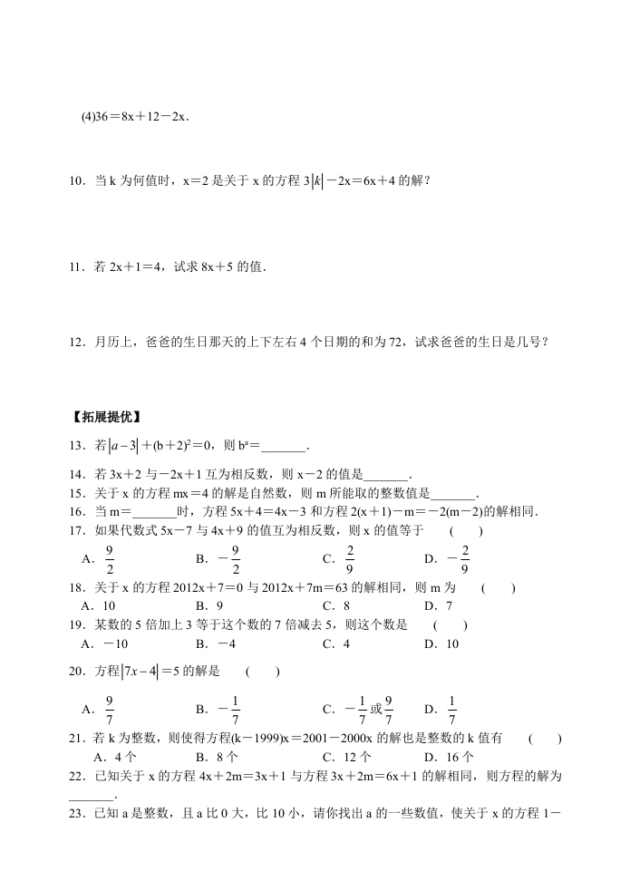 第3课时解一元一次方程(2)【基础巩固】1.在等式2a一3=b两边都加上3,可得等式2.如果y一2x=6,那么y=十6.3.方程2x-0.3=1.2+3x移项得4.下列四组变形中,属于移项变形的是()A.5x+4=0.5x=-4B.X=2,X=631C.2x-1=7,x=2D.5x=2,x=25.下列方程的变形中移项正确的是()A.从8+x=12得x=12+8B.从5x+8=4x得5x-4x=8C.从10x-2=4-2x得10x+2x=4+2D.从2x=3x-5得2x=3x-5=3x-2x=56.如果3ab2-1与abm+1是同类项,则n是()A.2B.1C.-1D.07.已知矩形的周长为20cm,设长为xcm,则宽为()A.(20-x)cmB.(10-x)cm20-C.(20-2x)cmD.-cm28.根据下列条件列出方程,然后求出x.x的2比9小6(2)x的3倍减去2,等于x的5倍加上3:(3)3x一4与2互为相反数.9.解下列方程:(1)8x-2=7x+2:②y+2-259y+7gy-7三y+(3)-2x=-3x+8: