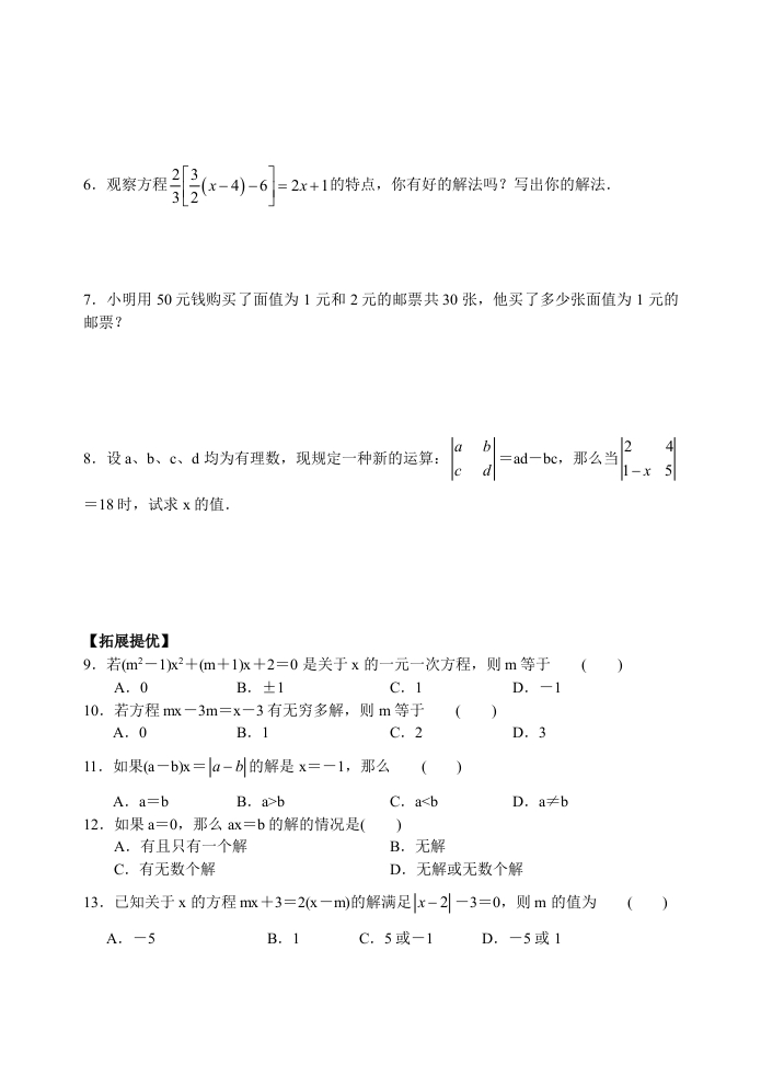 第4课时解一元一次方程(3)【基础巩固】1.方程(2x十1)一3(x一5)=0,去括号正确的是()A.2x+1-x+5=0B.2x+1-3x+5=0C.2x+1-3x-15=0D.2x+1-3x+15=02.方程12-(2x一3)=一(x一5)去括号得3.若2(4a一2)-6=3(4a-2),则代数式a2-3a+4=4.解下列方程:(14-3(x-1)=x+10:(2)7(m+1)=12-5(m+1):(34x+3(2x一3)=12-(x+4)(4)5(x-4)+2x=7-(x-1):(54(10-0.5x)=-3(x-2):(6)2(3-y)=-4(y-5).5.(1)当x取何值时,代数式3(2一x)和一2(3+2x)的值相等?(2)当x取何值时,代数式3(2一x)的值与一2(3+2x)的值互为相反数?(3)当y取何值时,2(3y+4)的值比5(2y一7)的值大3?