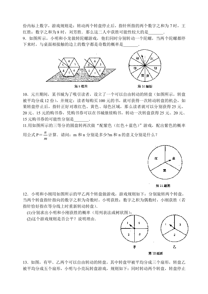 第5课时等可能性下的概率(四)1.如图,在一块菱形菜地ABCD中,对角线AC与BD相交于点O,若在菱形菜地内均匀地撒上种子,则种子落在阴影部分的概率是()A.1B.C.D.2342.如图所示,用扇形统计图反应地球上陆地面积与海洋面积所占比例时,陆地面积所对应的圆心角是108°,当宇宙中一块陨石落在地球上,则落在陆地上的概率是()A.0.2B.0.3C.0.4D.0.5海严本·闭#花第3性出些1陌丙第旺3.在如图所示的正方形纸片上做随机扎针实验,则针头扎在阴影区域内的概率为()】A.IB.3c4.在边长为1的小正方形组成的网格中,有如图所示的A,B两点,在格点上任意放置点C,恰好能使得△ABC的面积为1的概率为()38.6cD.56165.如图,正方形ABCD是一块绿化带,其中阴影部分EOFB,GHMN都是正方形的花圃.一只自由飞翔的小鸟,将随机落在这块绿化带上,则小鸟落在花画上的概率为()A.32B.2C.1736D.386.如图所示是一飞镖游戏板,大圆的直径把一组同心圆分成四等份,假设击中圆面上每个点都是等可能的,则落在黑色区域的概率为乙算6百树箸?恩阳席8地幽7.如图所示,在一长方形内有对角线长分别为2和3的菱形,边长为1的正六边形和半径为1的圆,则一点随机落在这三个图形内的概率较大的是8.王红和刘芳两人在玩转盘游戏,如图所示,把转盘甲、乙分别分成3等份,并在每一