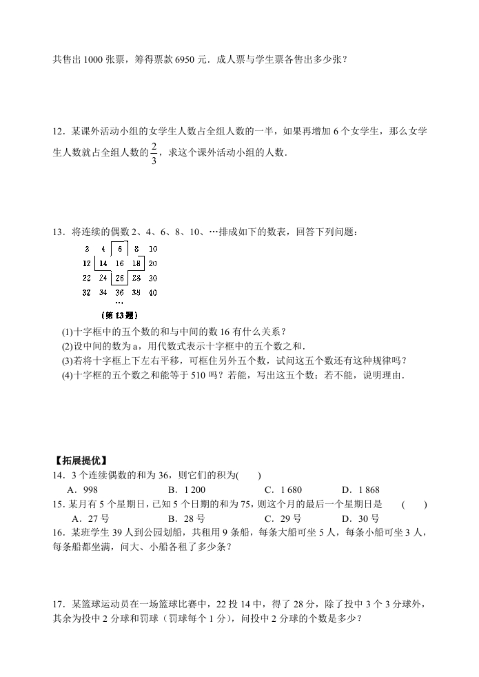 第6课时用方程解决问题(1)【基础巩固】1.小颗打算10天读完一本小说,假设每天读同样多页的内容,则一天读了全书的a天读了全书2.己知三个连续整数的和是33,则这三个数分别是3.小红同学在月历上找出一个数及它的上、下、左、右的四个数,发现这5个数的和是80,则这个数是,它的上、下、左、右的四个数分别是4.把一根长20cm的铁丝折成一个长方形,使它的长比宽长2cm,则它的面积为()A.20 cm2B.22 cm2C.24 cm2D.26 cm25.小悦买书需用48元钱,付款时恰好用了1元和5元的纸币共12张,设所用的1元纸币为x张,根据题意,下面所列方程正确的是()A.x+5(12-x)=48B.x+5(x-12)=48C.x+12(x-5)=48D.5x+(12-x)=486.己知有10包相同数量的饼干,若将其中1包饼干平均分给23名学生,最少剩3片,若将此10包饼干平均分给23名学生,则最少剩()A.0片B.3片C.7片D.10片7.甲、乙、丙三辆卡车所运货物的吨数的比是6:7:4.5,已知甲车比丙车多运货物12t,则三辆卡车共运货物多少吨?8.甲种铅笔每支03元.乙种铅笔每支0.6元,用9元钱买了两种铅笔共20支,两种铅笔各买了多少支?9.甲车队有50辆汽车,乙车队有41辆汽车,如果要使乙车队的车辆数比甲车队的2倍还多1辆,应从甲车队调多少辆车到乙车队?10.已知一个三角形的周长是36,且三边之比为3:4:5,则这个三角形的各边长分别是多少?11.某文艺团为“希望工程”募捐组织了一场义演,成人票每张8元,学生票每张5元,