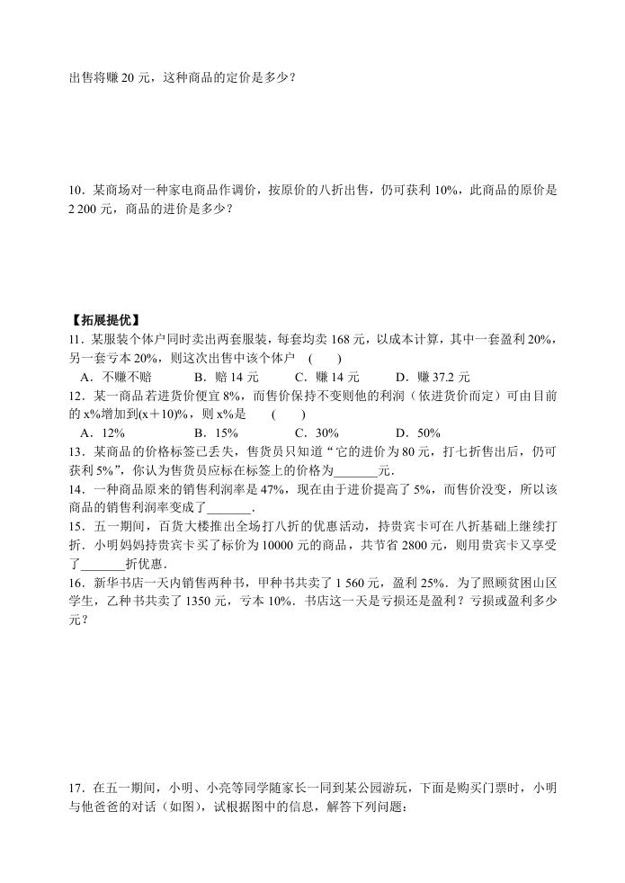第9课时用方程解决问题(4)【基础巩固】1.某商品以八折的优惠价出售一件少收入15元,那么这件商品的原价是()A.35元B.60元C.75元D.150元2.某商店的老板销售一种商品,他要以不低于进价20%的利润才能出售,但为了获得更多利润,他以商品进价80%的利润标价,若你想买下标价为360元的这种商品,最多降价a元商店老板才能出售,a的值为()A.80B.100C.120D.1603.一件商品按成本价提高20%标价,然后打九折出售,售价为270元,这种商品的成本价是4.某家用电器的标价为1540元,现降价以九折售出,仍可获利10%,则该电器的进价是5.某种商品的进价为100元,若要使利润率达20%,则该商品的销售价为多少元?此时每件可获利润多少元?6.服装销售中只要高出进价20%就可以盈利,但老板们常以50%~100%标价,假如你准备买一件标价200元的服装,可以在什么范围内还价?7.一家商店将某种服装按成本价提高40%后标价,又以八折(即标价的80%优惠卖出,结果每件比成本仍获利21元,这种服装每件成本是多少元?8.某商品的进价是2000元,标价为3000元,商品要求以利润率不低于5%的售价打折出售,售货员最低可以打几折出售此商品?9.某种商品因换季准备打折出售,如果按定价的七五折出售将赔25元:而按定价的九折