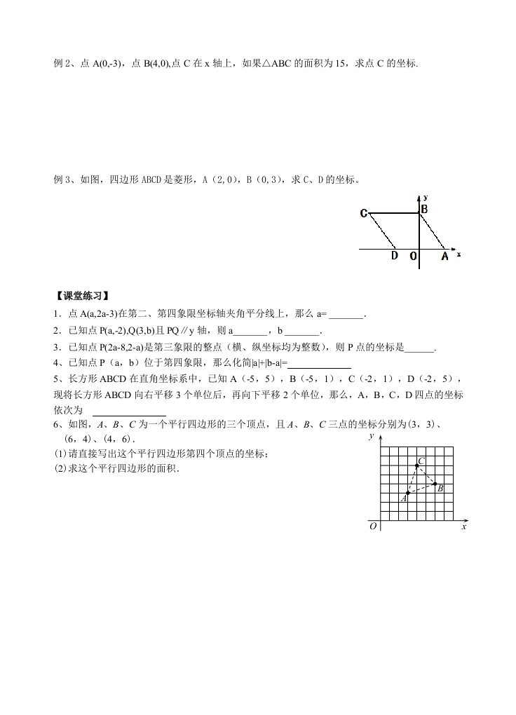 第四章数量、位置的变化【学习目标】1、熟练掌握平面直角坐标系中点的特征:2、通过描点、连线、看图以及由点找坐标等过程,发展学生的数形结合意识。【学习重点、难点】平面直角坐标系中点的特征。【知识要点回顾】1、若点P(x,y)在总(您手到》你源(1)第一象限,则x0,y0坐按行了.)丝御符式,》(2)第二象限,则X0,y0(3)第三象限,则x0,y0(4)第四象限,则x0,y0(5)x轴上,则x急家删丹业(6)y轴上,则x半探件了:人5:与〔】(7)原点上,则x2、点M(x,y)对称点的坐标特点:①关于x轴对称的点的坐标特点:②关于y轴对称的点的坐标特点:③关于原点对称的点的坐标特点:3、平面直角坐标系中的点和是一一对应的:4、点A(x,y)到x轴的距离是到y轴的距离是到原点的距离是5、各象限角平分线上的坐标特点:一、三象限角平分线上的点(x,y)的特点是二、四象限角平分线上的点(x,y)的特点是【自主检测】1、己知P点坐标为(2a+1,a-3),①点P在x轴上,则a=②点P在y轴上,则a=_:③点P在第三象限内,则a的取值范围是2、点A(2,3)到x轴的距离为:点B(一4,0)到y轴的距离为:点P(5,12)到原点的距离是一,点C到x轴的距离为1,到y轴的距离为3,且在第三象限,则C点坐标是一。4、已知a>0,那么点P(-a21,a+3)关于原点的对称点Q在第象限。5、△ABC中BC边上的中点为M,把△ABC向左平移2个单位,再向上平移3个单位后,得到△ABC1的B1C边上中点M的坐标为(一1,0),则M点坐标为【例题精选】例1、己知P点坐标为(2a+4,a3)①点P在x轴上,则a②点P在y轴上,则a③点P在第三象限内,则a④点P在第四象限内,则a⑤点P在一、三象限的角平分线上,则a⑥点P在二、四象限的角平分线上,则a