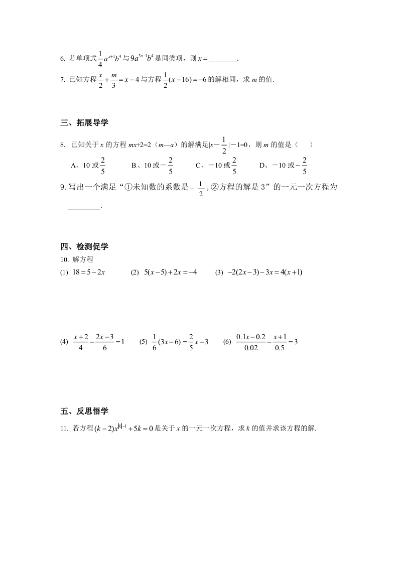 数学学科第四章《第四章小结思考1》学讲预案一、自主先学知识点1:方程是刻画现实世界的有效的数学模型1在一次数学竞赛考试中,小张同学做了10道选择题,选择题共10题,评分标准是答对一题得2分,不答或答错扣1分,小张得了14分,答对了x道题,根据题意列出方程知识点2:一元一次方程只含有,并且未知数的,这样的方程叫做一元一次方程。2.下列式子02+3=5②2x-5=1③+3=0④2x+3⑤2x=0⑥1+x=2⑦142x+5y=0⑧x2+6x+9=0是一元一次方程的是(填序号)知识点3:一元一次方程的解法和步骤变形名称具体做法变形依据去分母去括号移项合并同类项系数化为13.判断下列解方程过程中的错误之处有哪些?并请你写出正确求解过程0.2x-0.1_0.1-x=10.50.2解将分母化为整数2x-11二=1052去分母得:2(2x-1)-5-x=10去括号得4x-1-5-x=10移项得:4x+x=10-1+5合并同类项得:5x=14系数化为:x=514二、合作助学4.已知(+1)x1=5是关于x的一元一次方程,则=5.如果(2a-6)2+8+2bl=0,则(a+b)2015的值是