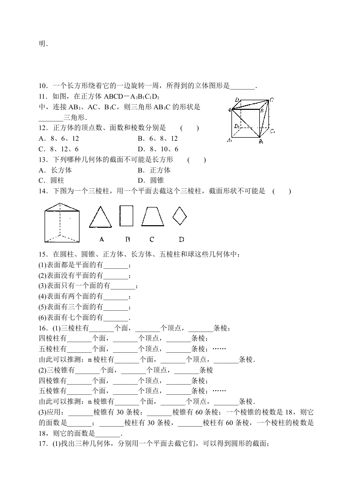 第五章走进图形世界5.1丰富的图形世界(1)1.图形是由构成的。2.圆柱的侧面是面,上、下两个底面都是3.有一个面是曲面的立体图形有(列举出三个).4.下列图形不是立体图形的是()A.球B.圆柱C.圆锥D.圆5.下列说法正确的是A.有六条侧棱的棱柱的底面一定是三角形B.棱锥的侧面是三角形C.长方体和正方体不是棱柱D.圆柱的上、下两底面可以大小不一样6.下面图形是棱柱的是()B7.写出下列立体图形的名称.8.如图,指出以下各物体是由哪些几何体组成的.(1)〔2)【3J1)9.你所在的校园内,有哪些物体的形状近似于圆柱、圆锥、棱柱、棱锥和球?请举例说