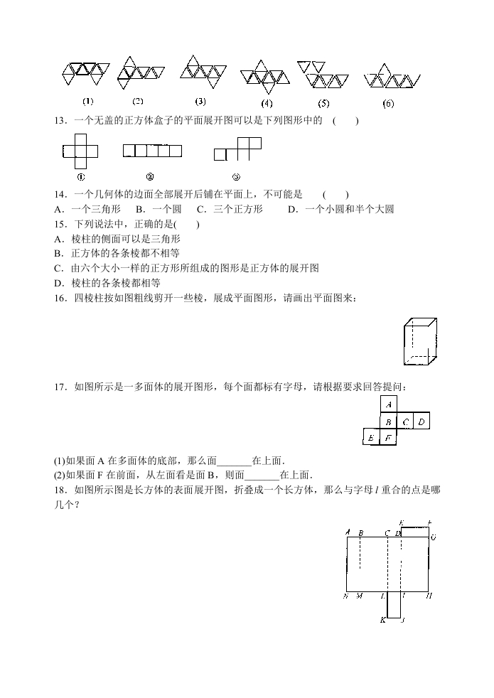 5.3展开与折叠(1)1.圆锥的侧面展开图是,圆柱的侧面展开图是2.侧面展开图是长方形的几何体有(写出三个)3.将一个无底无盖的圆柱剪开得到一个长方形,其中圆柱的等于长方形的一个边长,长方形的另一边长等于4.长方体从一点出发的三条棱长分别为2、3、4,则该长方体的表面积为,体积为5.用一个宽2cm,长3cm的长方形卷成一个圆柱,则此圆柱的侧面积6.在如图所示的图形中,是三棱柱的侧面展开图的是()B7.下列平面图形中不是棱柱展开图的是(A3D8.下面这些图形经过折叠可以围成一个棱柱吗?先想一想,然后动手折一折王了9.下面两图形分别是哪种多面体的展开图?若不能确定,做一做再回答.〔1)〔210.用一个边长为4cm的正方形折叠围成一个四棱柱的侧面,若该四棱柱的底面是一个正方形,则此正方形边长为cm.11.用一个边长为10cm的正方形围成一个圆柱的侧面,则该圆柱的体积是cm3.12.一个多面体的表面是由8个等边三角形组成的,当我们沿着它的棱把它剪开并展开为含8个等边三角形的平面图形,下列图形中有可能的是