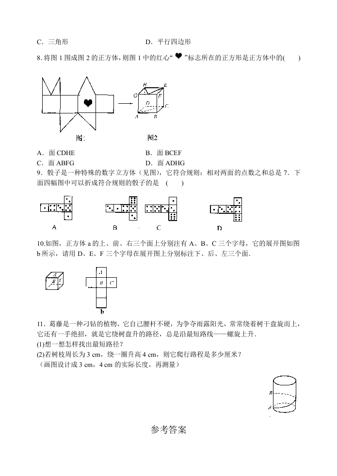 5.3展开与折叠(2)1.把一个立方体沿着某些棱剪开,使其既相连又能展开成平面图形,那么至少需要剪开条棱2.若要使图中平面展开图折叠成正方体后,相对面上两个数之和为6,则x=,y233.如图,四个三角形均为等边三角形,将图形折叠,得到的立体图形是()A.三棱锥B.圆锥体C.棱锥体D.六面体4.如图所示的立方体,如果把它展开,可以是下列图形中的5.在右图所示的正方体的平面展开图中,确定正方体上的点M、N的位置.6.下图是一个正方体的平面展开图,这个正方体是()7.将圆柱形纸筒沿母线剪开铺平,得到一个矩形(如图).如果将这个纸筒沿线路剪开铺平,得到的图形是()A.矩形B.半圆