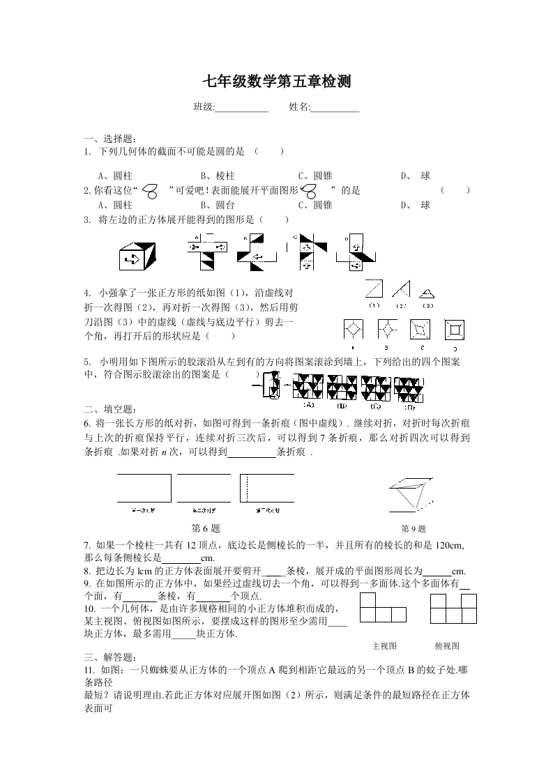 七年级数学第五章检测班级:姓名:一、选择题:1.下列几何体的截面不可能是圆的是(A、圆柱B、棱柱C、圆锥D、球2.你看这位“3”可爱吧!表面能展开平面图形名”的是A、圆柱B、圆台C、圆锥D、球3.将左边的正方体展开能得到的图形是(4.小强拿了一张正方形的纸如图(1),沿虚线对☑△折一次得图(2),再对折一次得图(3),然后用剪13刀沿图(3)中的虚线(虚线与底边平行)剪去一个角,再打开后的形状应是(下回回5.小明用如下图所示的胶滚沿从左到有的方向将图案滚涂到墙上,下列给出的四个图案中,符合图示胶滚涂出的图案是(二、填空题::A)ty6.将一张长方形的纸对折,如图可得到一条折痕(图中虚线).继续对折,对折时每次折痕与上次的折痕保持平行,连续对折三次后,可以得到7条折痕,那么对折四次可以得到条折痕如果对折n次,可以得到条折痕·-次.的二次小于一次行第6题第9趣7.如果一个棱柱一共有12顶点,底边长是侧棱长的一半,并且所有的棱长的和是120cm那么每条侧棱长是cm.8.把边长为lcm的正方体表面展开要剪开条棱,展开成的平面图形周长为cm9.在如图所示的正方体中,如果经过虚线切去一个角,可以得到一多面体这个多面体有个面,有条棱,有个顶点10.一个几何体,是由许多规格相同的小正方体堆积而成的,某主视图、俯视图如图所示,要摆成这样的图形至少需用块正方体,最多需用块正方体主视图俯视图三、解答题:11.如图:一只蜘蛛要从正方体的一个顶点A爬到相距它最远的另一个顶点B的蚊子处.哪条路径最短?请说明理由若此正方体对应展开图如图(2)所示,则满足条件的最短路径在正方体表面可