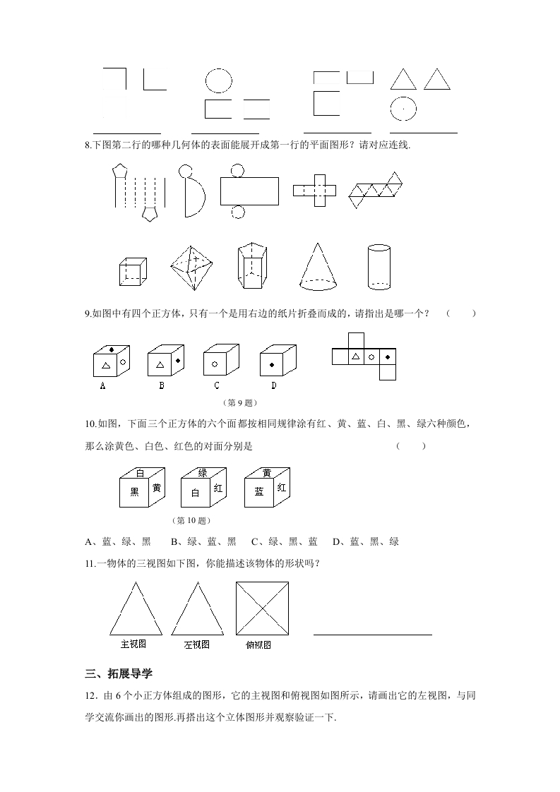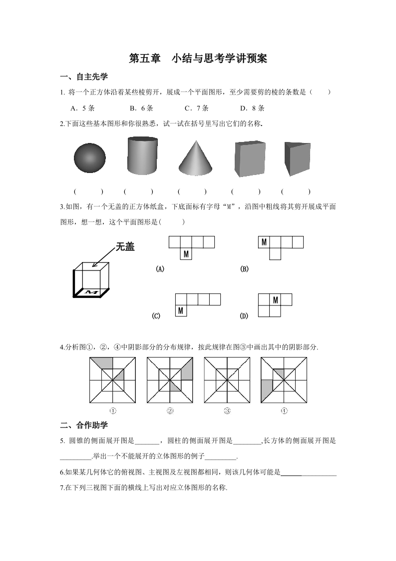 第五章小结与思考学讲预案一、自主先学1.将一个正方体沿着某些棱剪开,展成一个平面图形,至少需要剪的棱的条数是()A.5条B.6条C.7条D.8条2.下面这些基本图形和你很熟悉,试一试在括号里写出它们的名称.)()()()(3如图,有一个无盖的正方体纸盒,下底面标有字母“”,沿图中粗线将其剪开展成平面图形,想一想,这个平面图形是(无盖M(A))MM(C)(D)4.分析图①,②,④中阴影部分的分布规律,按此规律在图③中画出其中的阴影部分①②③二、合作助学5.圆锥的侧面展开图是,圆柱的侧面展开图是长方体的侧面展开图是.举出一个不能展开的立体图形的例子6.如果某几何体它的俯视图、主视图及左视图都相同,则该几何体可能是7在下列三视图下面的横线上写出对应立体图形的名称。