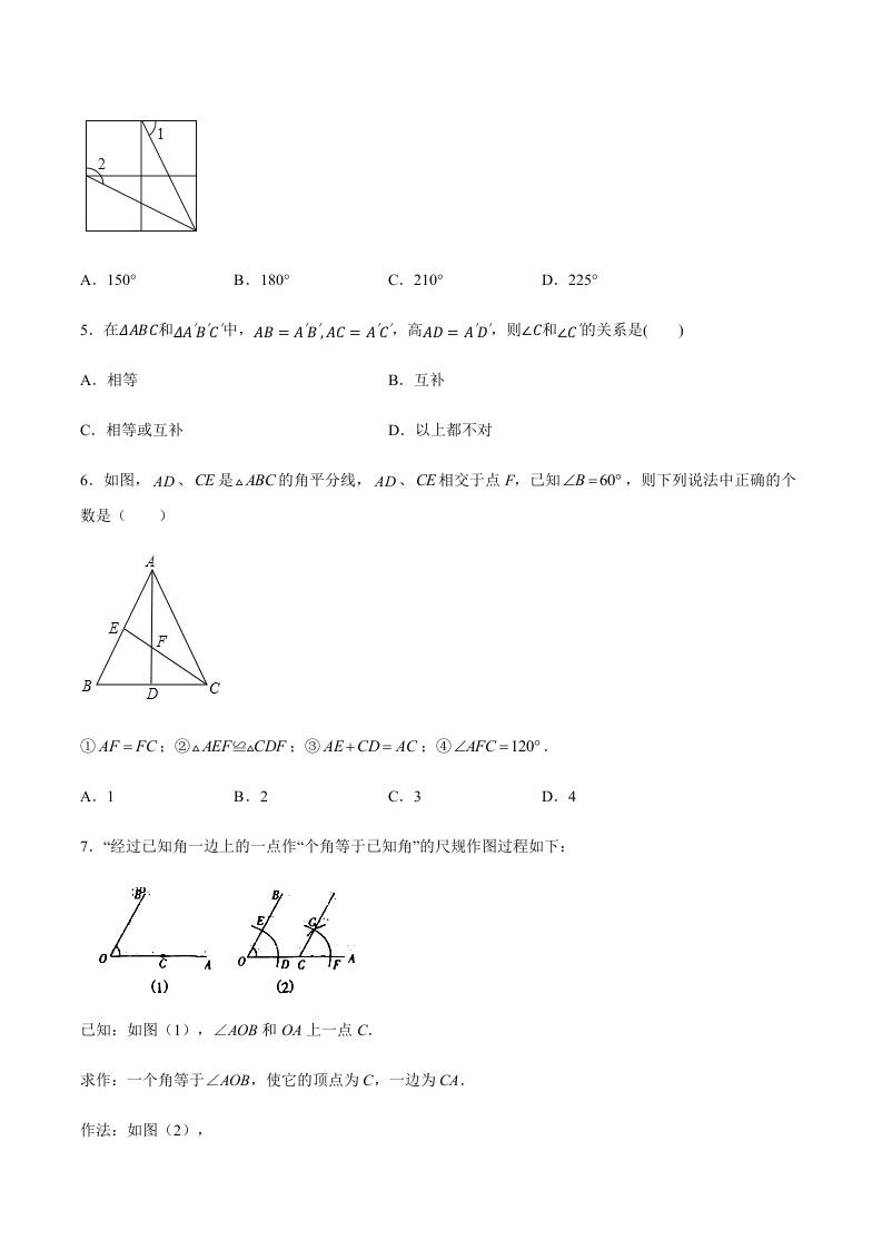 第一章全等三角形单元检测卷总分:150分难度:难一、单选题(每题3分,共24分)1.下列命题中的假命题是()A,等边三角形的一个内角的平分线把这个等边三角形分成的两个三角形全等B.等腰三角形底边上的中线把这个等腰三角形分成的两个三角形全等C.等腰直角三角形底边上的高把这个等腰直角三角形分成的两个三角形全等D.直角三角形斜边上的中线把这个直角三角形分成的两个三角形全等2.工人师傅常常利用角尺构造全等三角形的方法来平分一个角.如图,在∠AOB的两边OA、OB上分别在取OC=OD,移动角尺,使角尺两边相同的刻度分别与点C、D重合,这时过角尺顶点M的射线OM就是∠AOB的平分线.这里构造全等三角形的依据是()A.SASB.ASAC.AASD.SSS3.若△ABC≌△DEE且AB=8厘米,BC=7厘米,AC=6厘米。则DF的长为()A.8厘米B.7厘米C.6厘米D.5厘米4.如图是由4个相同的小正方形组成的网格图,其中∠1+∠2等于()