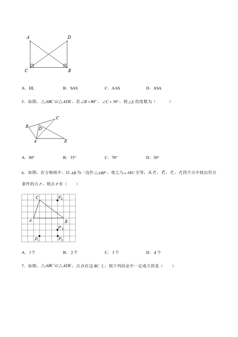 第一章全等三角形单元检测卷总分:150分难度:易一、单选题(每题3分,共24分)1.如图,己知△ABC的六个元素,则下面甲、乙、丙三个三角形和△ABC全等的图是()505058°725850K509b丙A.甲和乙B.乙和丙C.只有乙D.只有丙2.直尺和圆规作图(简称尺规作图)是数学定理运用的一个重要内容如图所示,作图中能得出∠AOB=∠AOB的依据是运用了我们学习的全等三角形判定()DBA.角角边B.边角边C.角边角D.边边边3.如图,己知MB=ND,∠MBA=∠NDC,添加下列条件仍不能判定△ABM≌△CDN的是()A.∠M=∠NB.AM=CNC.AB=CDD.AM//CN4.如图,AC⊥CB,DB⊥CB,垂足分别为C,B,AC=DB,则可以直接判定△ACB≌△DBC的根据是()