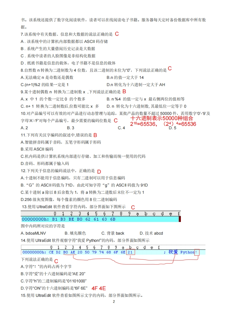 答案1-5 CABAB6-10 DCCBC11-15 BDCCD16-20 CCCBC21-25 DABCC 26-30 BBCDA第一章数据与信息练习(高二上信息暑假作业)班级:姓名:1.下列关于数据与信息的说法,正确的是CA.计算机中的数据只能以结构化的形式存在B.大数据分析的是抽样数据,而不是全体数据C.数据是对客观事物的符号表示D.与物质、能源相同,信总也会因为被别人获取而发生损耗阅读下列材料,回答第2题:为了提高学校路口等易发事故路段的安全性,交通部门采取了精细化的信号灯管控措施。经过对某校路口近一年来的交通流监测数据的深入分析,交通部门决定在高峰时段(上午7点30分到7点50分,下午16点到16点50分)采用常规的红绿灯模式,而在其他时段仅维持“黄闪”模式,用以提醒司机减速慢行,保障行人安全。2.下列关于数据、信息与知识的说法,不正确的是AA.“上午7点30分"中的数字30”是信息B.信号灯是载体,信息的传递必须依附于载体C.分时段采用常规红绿灯模式和“黄闪”模式是知识的体现D.交通部门对车流量和人流量等数据进行分析属于信息的加工处理3.下列关于数据和信息的说法,正确的是BA.数据是信息的载体,只要有足够的数据,就获得了足够的信息B.在数据处理的过程中,可能产生新的数据和信息C.数据必须经过数字化,才能被加工处理D.计算机中各种类型数据均采用二进制方式存储,且编码方式也相同不相同4.下列关于数据与信总的说法,不正确的是AA.信息的传播可以不依附于载体B.信总对不同人群,其价值可能不同C.数据是现代科学的重要资源D.计算机中数据都以二进制编码存储5.下列有关信息、数据的说法正确的是BA信息具有载体依附性,我们阅读时看到的文字就是信息B.信息往往会随着时间的推移而变化C.文本数据在计算机中都以十六进制的形式存储二进制D数据的表现形式是单一的,只能是数字6.下列关于数据、信息和知识的说法,正确的是DA.乘坐火车时不需要提供纸质火车票,说明信息可以不依附于载体B.银联卡因失去磁性无法读取,这说明信息在重复使用中会产生损耗C.数据以二进制或王入进制方式编码后,才能存储在计算机中D.学生将老师整理的题目顺利解题,是运用已学知识的体现阅读下列材料,回答第7题。某智能图书馆系统的部分功能是:读者在借书、还书时须通过摄像头刷脸进行身份验证,人脸数据加密后存储在数据库中。系统利用RFD技术,自动识别图书并记录借阅信总。借还记录自动保存到服务器的数据库中,系统可自动生成借阅历史报告。用户查找图书时,系统可根据读者的检索及借阅历史记录,推荐相关图y