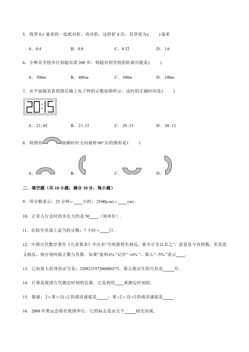 第一章我们与数学同行单元检测卷总分:120分难度:中一.选择题(共8小题,满分24分,每小题3分)1.如图,“时”是电视机常用尺寸,1时约为大拇指第一节的长,则9时长相当于()A.一支粉笔的长度B.课桌的长度C.黑板的宽度D.数学课本的宽度2.从北京到天津坐高速汽车约需(A.1小时B.2.0小时C.3.5小时D.0.5小时3.在“算经十书中,《九章算术》是中国古代记载最全面完整的一部著作,它的出现标志中国古代数学形成了完整的体系,而《海岛算经》则是中国最早的一部测量数学专著,使“中国在数学测量学的成就,超越西方约一千年”,这两本著作是下列哪位数学家留给后世的宝贵数学遗产()杨辉1祖冲之秦九韶D.刘微4.有人用600元买了一匹马,又以700元的价钱卖了出去:然后,他再用800元把它买回来,最后以900元的价钱卖出.在这桩马的交易中,他()A.收支平衡B.赚了100元C.赚了300元D.赚了200元