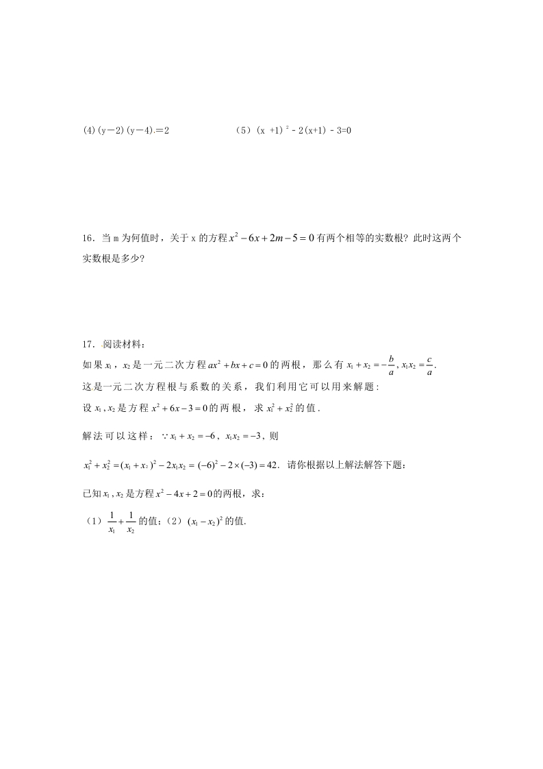 一元二次方程一、选择题(每小题3分,共24分)1.下面关于x的方程0ax+bx+c=0:②(x-9)2=1:③x+3=1:④4x+2x-1=0:⑤√x+1=x一1中,一元二次方程的个数是()A.1B.2C.3D.42.用配方法解方程x2+4x+1=0,配方后的方程是()A.(x+2)2=3B.(x-2)2=3C.(x-2)2=5D.(x+2)2=53.己知一元二次方程x2-6x+c=0有一个根为2,则另一根为()】A.2B.3C.4D.84.关于x的方程(m2-m一2)x2+mx+n=0是一元二次方程的条件是()、A.m≠-1B.m≠2C.m≠一1或m≠2D.m≠1且m≠25.三角形的两边分别为2和6,第三边是方程x2一10x+21=0的解,则第三边的长为()A.7B.3C.7或3D.无法确定6.已知关于x的一元二次方程(a一1)x2-2x+1=0有两个不相等的实数根,则a的取值范围是(】A.a>2B.a<2C.a<2且a≠1D.a<一27.关于x的一元二次方程x2-ar-1=0(其中a为常数)的根的情况是()A.有两个不相等的实数根B.可能有实数根,也可能没有实数根C.有两个相等的实数根D.没有实数根8.a、b、c是△ABC的三边长,且关于x的方程x2-2cx十a+b=0有两个相等的实数根,这个三角形是A.等边三角形B.钝角三角形C.直角三角形D.等腰直角三角形二、填空题(每小题4分,共24分)9.(x+3)2-3x=5x2化为一元二次方程的一般式得,它的一次项系数是10.当m=时,关于x的方程(m+2)x-2+6x一9=0是一元二次方程.11.若方程x2-X=0的两个根为X,X(x