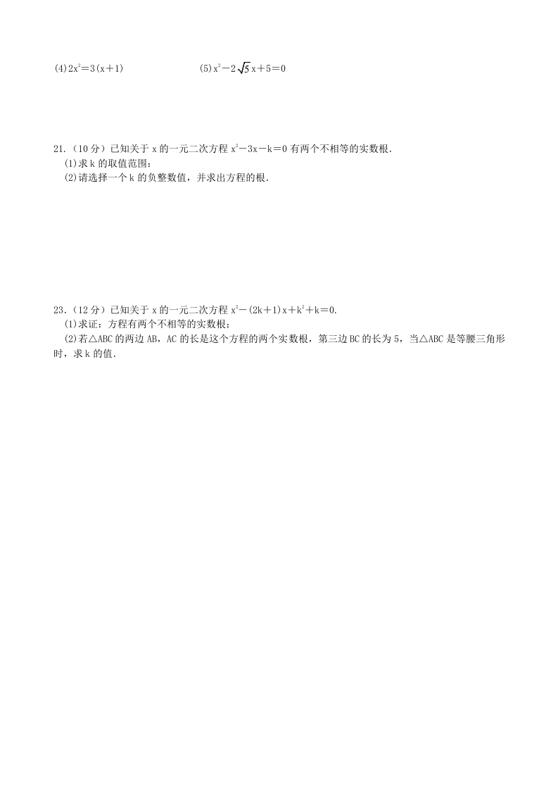 一元二次方程一、选择题(每题3分,共24分)1.下列方程是一元二次方程的是A.X-2=0B.x2-4x-1=0C.x2-2x-3D.xy+1=02.一元二次方程x+x一2=0的两根之积是()A.-1B.-2C.1D.23.用配方法解方程x2一2x一5=0时,原方程应变形为()A.(x+1)2=6B.(x-1)2=6C.(x+2)2=9D.(x-2)2=94.已知三角形两边的长是3和4,第三边的长是方程x一12x十35=0的根,则该三角形的面积为.()A.6B.12C.6或12D.以上都不对5.己知m,n是方程x2-2x-1=0的两根,且(7m2.-14m+a)(3n2-6n-7)=8,则a的值等于()A.-5B.5C.-9D.96.如果关于x的一元二次方程kx2-(2k十1)x+1=0有两个不相等的实数根,那么k的取值范围是()A.k>-B.k≥-且k≠04cK-号D.k0-且k≠047.若关于x的一元二次方程(m一1)x2+5x+m2一3m+2=0有一个根为0,则m的值等于()A.1B.1或2C.2D.08.己知a,b,c分别是三角形的三边,则方程(a+b)x2+2cx+(a+b)=0根的情况是()A.没有实数根B.可能有且只有一个实数根C.有两个相等的实数根D.有两个不相等的实数根二、填空题(每题4分,共24分)9.方程x2-4x=0的解是10.若将方程x2+6x=7化为(x十m)2=16,则m=11.若关于x的一元二次方程x2一mx一2=0的一个根为x=一1,则另一个根为x=12.如果关于x的方程X-6x+0有两个相等的实数根,那么F13.已知x,x2是一元二次方程x2+2ax+十b=0的两个实数根,若x1十x2=3,x1x2=1,则a=」14.若关于x的一元二次方程x2-x一3=0的两个实数根分别为a,B,则(a+3)(B+3)=三、解答题15.(30分)解下列方程.(1)(x-2)2=5:、(2)x2-8x一10=0(配方法):(3)3(x-3)2+X(x-3)=0:
