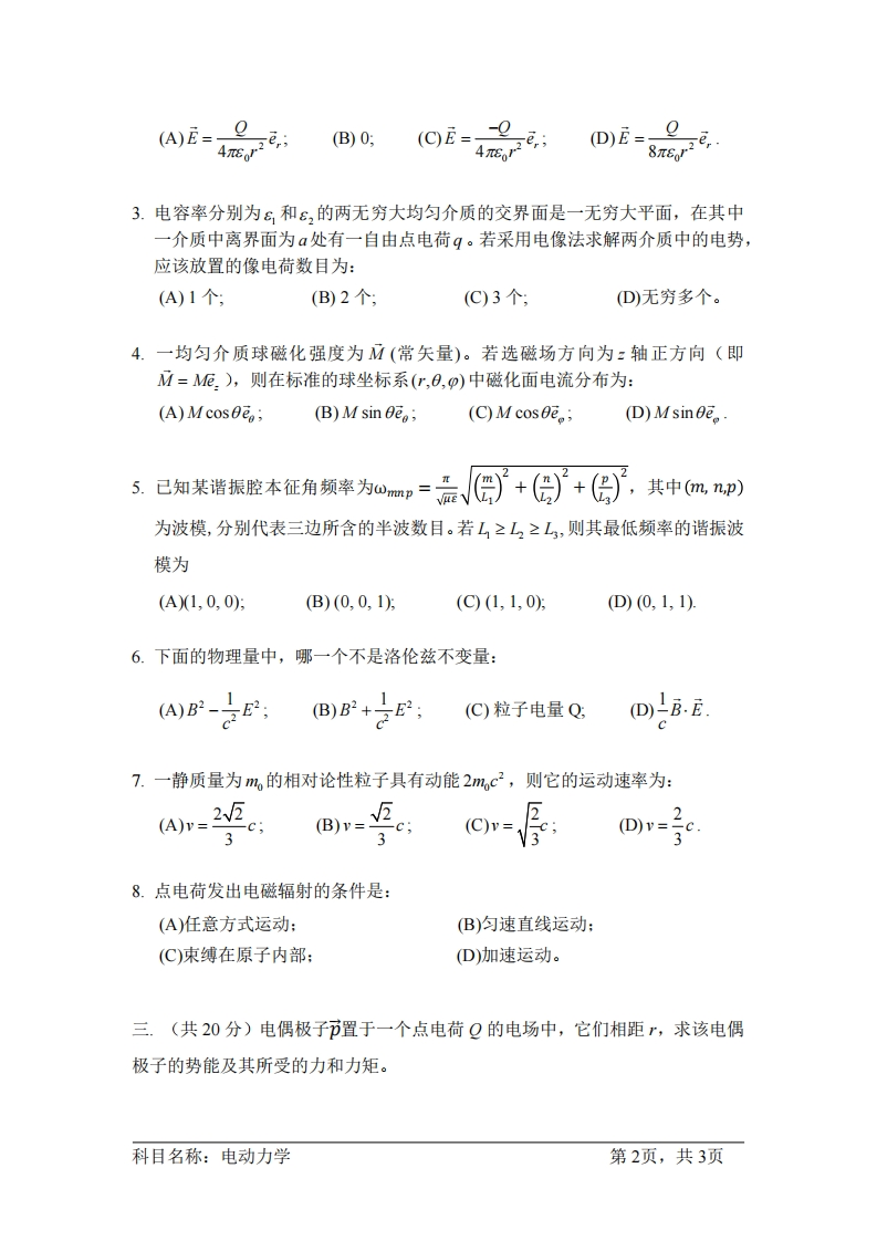 中国科学院大学2020年招收攻读硕士学位研究生入学统一考试试题科目名称:电动力学考生须知:1.本试卷满分为150分,全部考试时间总计180分钟。2.所有答案必须写在答题纸上,写在试题纸上或草稿纸上一律无效。一.简答题(每题10分,共40分)。1.写出真空中无源的微分形式的麦克斯韦方程组,并由此导出电场强度和磁感应强度B满足的波动方程。2.简述狭义相对论的基本假设。3.写出两种均匀、各向同性介质的交界面处的电场强度E、磁场强度五、电位移矢量D、磁感应强度B的边值关系。4.用千克、米、秒、安培表示出以下物理量的单位:电场强度,磁感应强度,电位移矢量,能量密度,能流密度。二.单项选择题(每题5分,共40分)。1.下列公式中,错误的是:(A)7(f×g)=(7×)g-子.(7×g);B)fx×万=2r2-f.:(C)7.(f×g)=(×)g+子.(×g);D)7×(×f)=(.-V2f2.一半径为1、带电为Q的实心导体球被一个内外半径分别为”2和的中空导体球壳包围(3>>),并处于静电平衡,则导体球壳内部(3和之间)的电场为:科目名称:电动力学第1页,共3页
