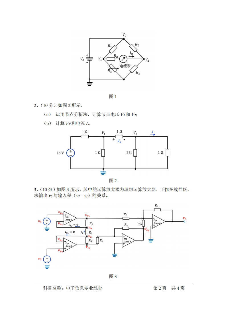 中国科学院大学2020年招收攻读硕士学位研究生入学统一考试试题科目名称:电子信息专业综合考生须知:1.本试卷满分为150分,全部考试时间总计180分钟。2.所有答案必须写在答题纸上,写在试题纸上或草稿纸上一律无效。3.可以使用无字典存储和编程功能的电子计算器。一、(30分)给出以下术语的定义或解释其含义。(1)电路(6)漂移电流(2)电路分析(7)线与(3)节点(8)补码(4)电压Vb(9)信源熵(5)n-型半导体(10)相干解调二、简答以下各题(50分)1、(10分)简述集总电路抽象遵循的集总事物原则施加的三条约束及其意义。2、(10分)简述交流分析的相量域分析法与拉普拉斯域变换法,并比较它们的特点和用途。3、(10分)CMOS门电路的动态功耗与哪些电路参数有关?4、(10分)三态输出的缓冲器有哪些用途?5、(10分)解释最佳基带传输系统的含义。在理想信道下的最佳基带传输系统的结构具有什么特点?三、计算与证明题(60分)1、(10分)对于图1所示的惠斯通电桥,求解下列问题:(a)如果R1=1,R2=22,Rx=32,则在电桥平衡条件下,R3=?(b)如果Vo=6V,Ra=0.12,调整R的值从Rx=3到Rx=3.012,则电流表上的读数是多少?科目名称:电子信息专业综合第1页共4页