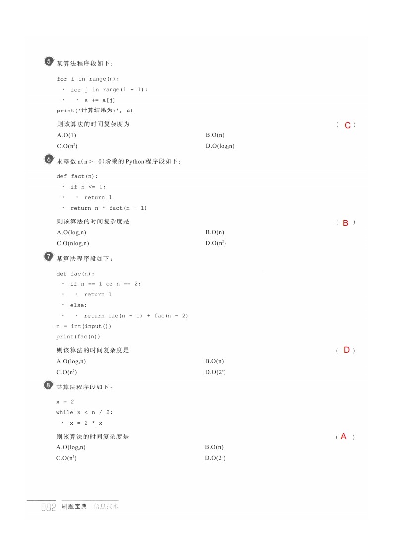 刷题点1答案:刷题点2答案:1-5BABAC 6-8 BDA1-5ACACD 6-10DDCAA 11-15DBDCA第6刷迭代与递归刷题点1算法效率典题密加1数据结构的不同会影响算法的运行效率①下列关于算法效率的说法,正确的是2.算法效率的高低由算法复杂度衡量(B)A.算法效率指的是算法的时间复杂度3.算法复杂度分为时间复杂度和空间复杂度B.通常随着问题规模n的增大,函数值增长较慢的算法较优C时间复杂度常用符号T类惑亞罢2:na:),其时间复杂度可以表示为TD.常见的时间复杂度耗费命间的失小关系为:常数阶<对数阶<指数阶<平方阶②某算法程序段如下:0(1)<00og2n)<0(n)<0(n2)<0(2)<0(nl)常数阶<对数阶<线性阶<平方阶<指数阶<阶乘阶a-1;b=2a,b =b,aprint (a,b)则该算法的时间复杂度为(A)A.01)B.O(n)c.0(n)D.O(log:n)3某算法程序段如下:for i in range(1,n):·a[i]"a[i-1]+1for i in range(n):·s+=a[i]print(s)则该算法的时间复杂度为B)A.0(1)B.0(n)C.0(n)D.O(log:n)④在一个单向链表中,在头部插入一个新元素的算法时间复杂度为A.01)在任意地方插入节点,复杂度为O(n)B.O(n)c.0(nD.O(logn)第6刷选代与递1081