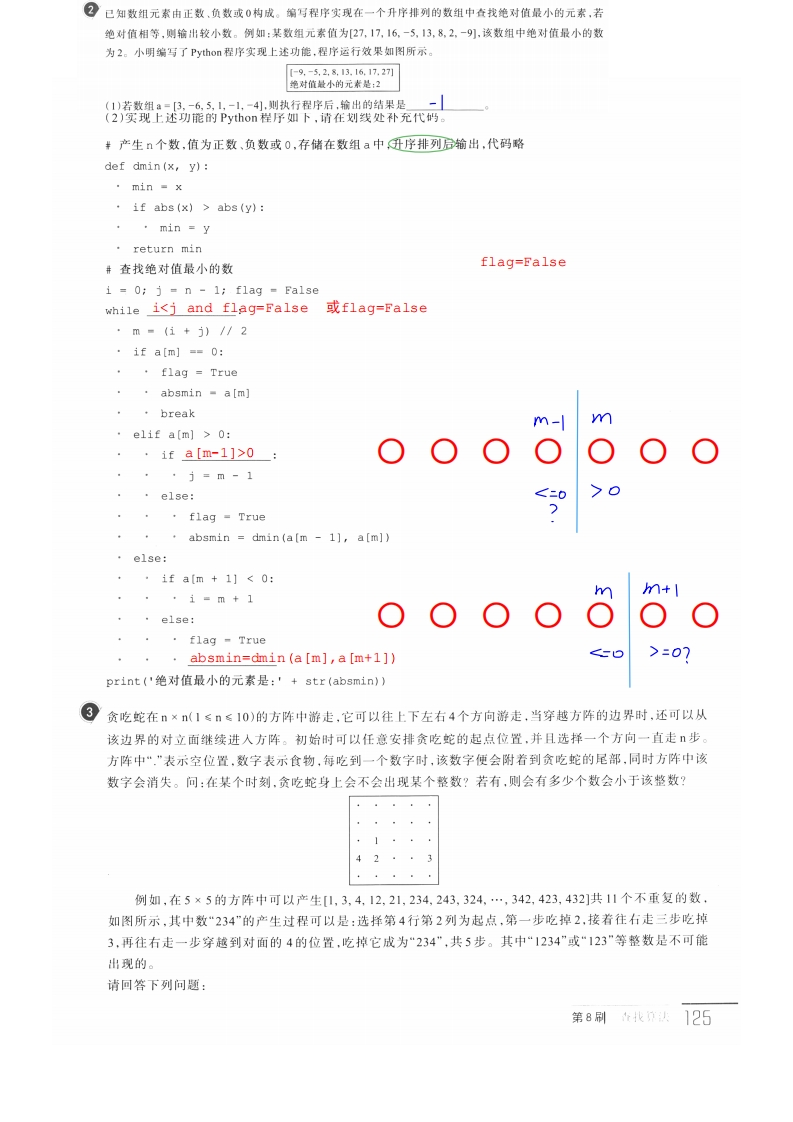 刷题点4二分查找算法的应用典题密训①将十进制数n(2“≥n≥3)转换为k(k≥2)进制数,若所有数位全为1,则称k是n的一个好进制数。例如,十进制数31可以转换为(11)和(11111):,因此30和2均是31的好进制数,其中2为31的最小好进制数。请回答下列问题:(1)十进制数21的最小好进制数k是4(2)小明编写如下Python程序,找出n的最小好进制数k,请在划线处补充代码。n~int(input('输人一个十进制数:')def check (k,m):checki函数计算(m个1)k=()10·#计算m位全为1的进制的十进制值,如二进制数111的十进制值为7ans =0·for i in range(m)··ans十=k*刻或ans十=ans十1·return ansans nfor length in range(2,65):=2(至少2进制1·j=n-1·while i<=:··mid▣(i+j)//2tmp check(mid,length)说明i,j是进制的范围·if tmp==n:if ans>mid:ans =midbreak算出来十进制的偏小elif tmp