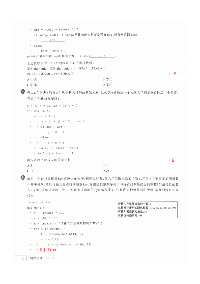 key:··j=m-1·else:+·1=m+1print(s[m],end =','执行该程序段后,下列关于执行结果(x和不相等)的说法,不正确的是(AA.若输出结果是“a,X,a,”,则x是比a小的数相等时往后找B.若输出结果是“a,x,a,”,则x是比a大的数C.若输出结果是“a,X,a,”,则列表s中最少有6个元素D.若输出结果是“a,x,a,”,则列表s中最多有9个元素有如下Python程序段:import randoma=[2,3,5,8,10,10,10,17,19,20]key■random,randint(l,30)#随机生成[l,30]之间的整数i,j=0,9while i key:·*5=m-1·else:*·1=m+1print (j)执行该程序段后,下列说法正确的是(BA.若key的值为10,则输出的结果是36B.若输出的结果是8,则key的值一定为I9C.对于任意kcy值,语句“m=i+j)M2"最少执行1次3D.对于任意key值,语句“m=(+j)∥2”最多执行3次4③某软件版本号有1,2、…,(整数)。公司新开发的测试程序检测出版本n存在bug(从某个版本开始一直延续到版本n),为查找最早出现bug的版本号,编写Python程序,部分代码如下:Left,Right 1,nwhile Left Right:第8刷在找9法119