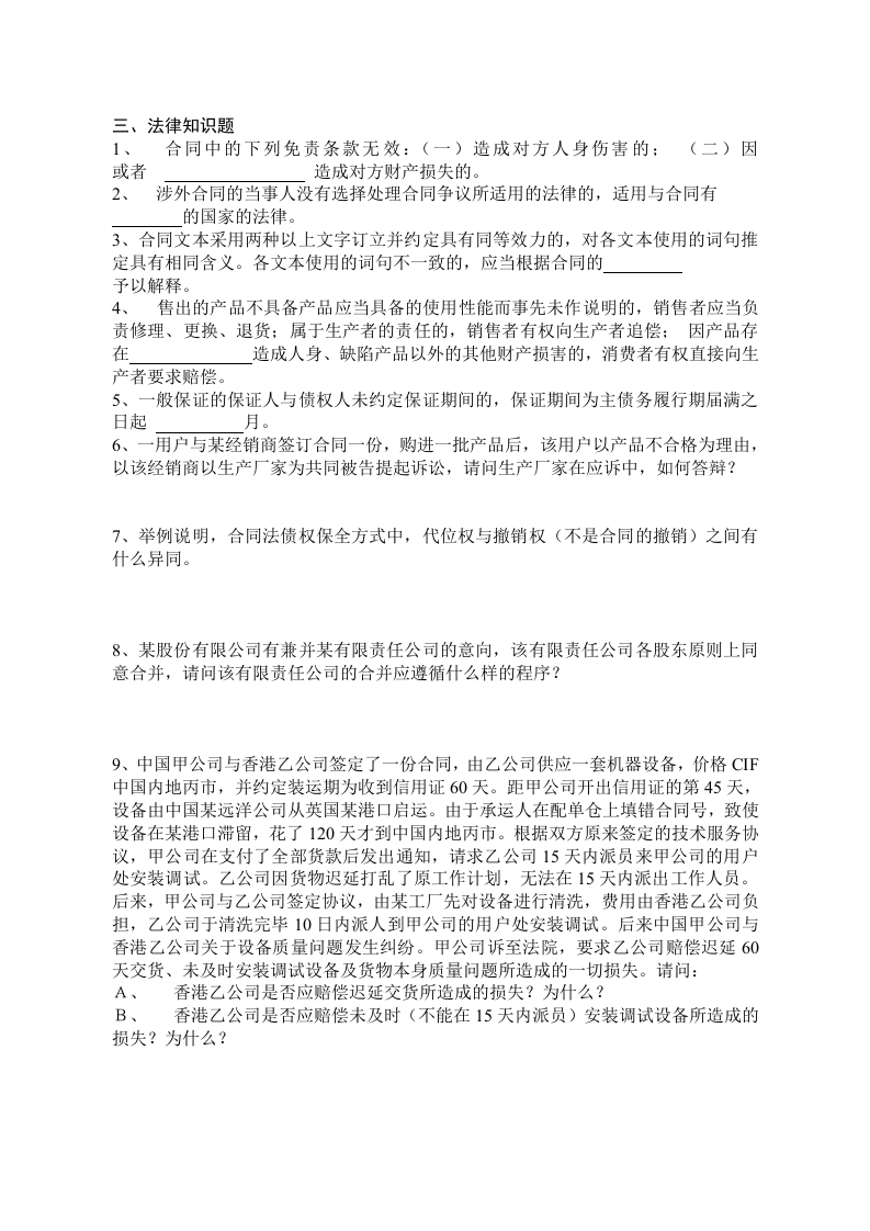 法律招聘试题一、智力题(本部分应在8分钟内完成):1、有人用60美元买了一匹马,又以70美元卖了出去。然后他又用80美元把它买了回来,最后以90美元的价钱卖出。在这桩马的交易中,他总共():A赔了10美元B收支平衡C赚了10美元D赚了20美元E赚了30美元2、从招聘启示上看,玫瑰公司与紫罗兰公司的待遇,除以下两项略有不同外,其余方面是完全相同的。A、玫瑰公司:(1)半年工资50万元:(2)工资每半年增加5万元:B、紫罗兰公司:(1)年工资100万元:(2)工资每年增加20万元。张先生想去工资比较高的公司就职。因此,他将会选择()公司,去该间公司,他将比去另一个公司每年多收入()元3、某鞋店出售一种新鞋,由于在市场上很畅销,老板就将它提价10%,不料没多久,又成了滞销品,老板为尽快售完,只得在提价的10%的基础上削价10%出售。问:这种鞋的价格是什么时候较低的?A削价10%以后B提价10%以前C实际上价格不变4、尼娜买了一只手表,戴上当天就发现它比家里的小闹钟每小时要快2分钟,后来,她又发现家里的闹钟比电台播报的标准时间每小时慢2分钟,因此:A、手表指示的时间是准的:B、手表指示的时间比标准时间要快:C、手表指示的时间比标准时间要慢。5、一套丛书连同书盒售价2.5美元,书店也允许只买书不买书盒,书价比书盒贵2美元,因此,书盒售价为()美元。6、A、B、C三个学生到法国某海滨城市度假,住在一家旅馆。他们每人先向旅馆预交了100法郎的房钱。正当会计准备将300法郎入帐时,旅馆老板说:“他们是穷学生,就退还50法郎好了。”不想会计不怀好意。他想:“三个人分50法郎,一定要出现零头,不好分。”于是他把20法郎装到自己的腰包,只退给每人10法郎。这样一来,就出现一个问题:实际上每个学生只拿出90法郎,三人共270法郎,加上会计贪污的20法郎,一共290法郎。那么,原先300法郎中的10法郎哪里去了呢?请画图或者列出等式说明。二、英文题(翻译)Technical Document and any other information or knowledge furnished or madeavailable by Toshiba to MD hereunder are for MD's own use in connection with themanufacture of Contract Products by MD and are to be kept confidential during theterm of this Agreement and for two (2)years thereafter,and are not to be given,soldor disclosed by MD to any other party without prior written consent of Toshiba.