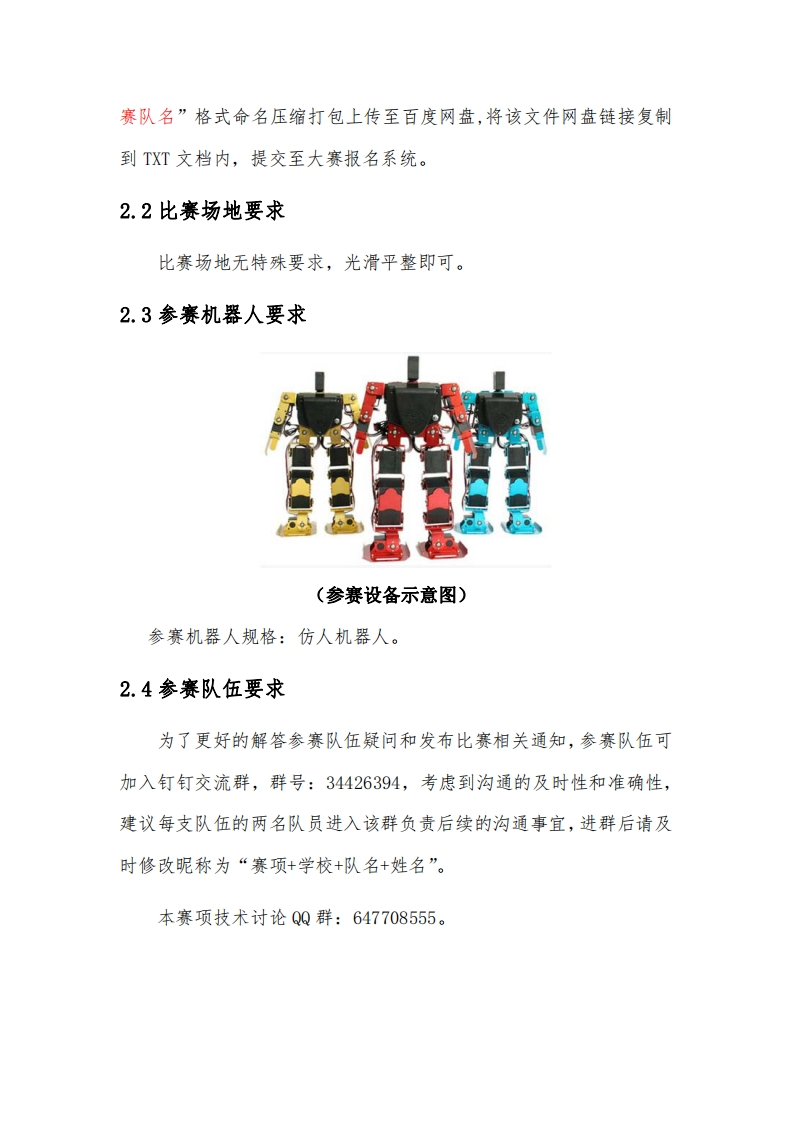 仿人舞蹈竞技(多人舞)比赛规则一、竞赛介绍该比赛主要围绕仿人机器人领域,开展仿人机器人复杂动作规划、通讯、控制等技术研究,进行该比赛,可以锻炼学生的动手能力、编程能力、创造性思维等能力,同时提高仿人机器人在舞蹈中对动作的复杂性与艺术性及动作与音乐的配合。二、竞赛规则2.1竞赛形式各参赛队将参赛作品资料,在规定的时间内提交大赛组委会,组委会组织评审专家对参赛作品进行资格审核和初赛评审,评选出排名靠前的队伍进入线上决赛。初赛作品提交材料要求:(1)提交的作品资料内容必须与竞赛规则要求相符;(2)作品照片2张,精度300dpi-600dpi,格式为jpg;(3)完成竞赛任务的视频,视频格式为MP4,视频要求见下文竞赛细则。(4)所有队伍均需提供技术报告,报告中应包含方案概述、技术方案、队伍名称、指导老师和队员信息等,格式自拟;(5)将作品材料(图片、视频、设计报告、)按“赛项+学校+参